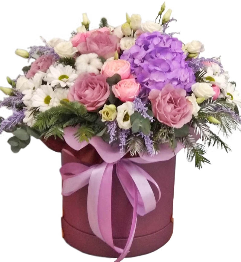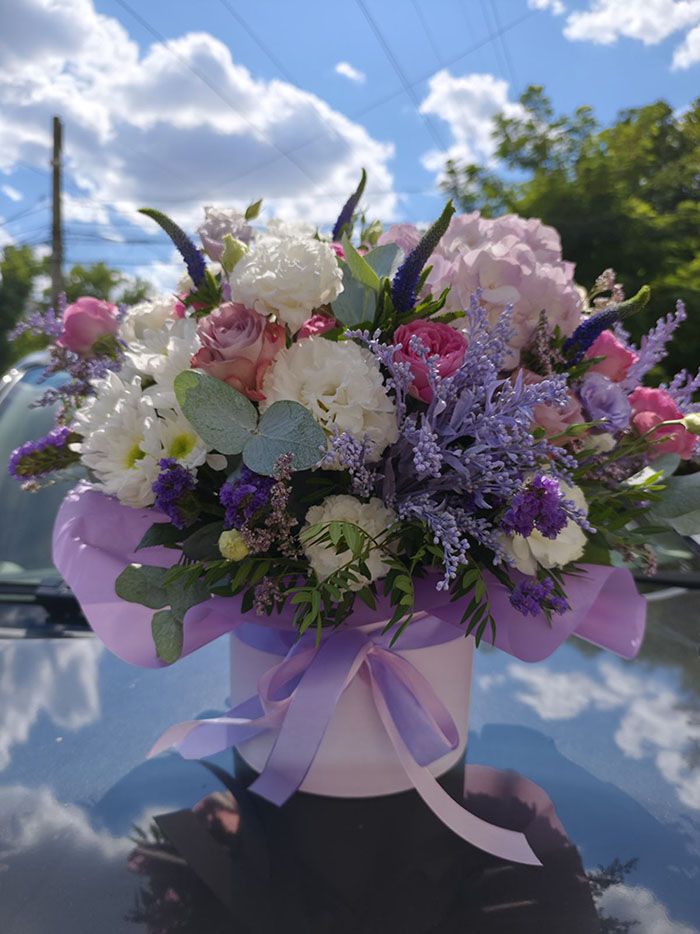 A Hat Box flower arrangement in pink, lilac and white tones at a hat-box looks really impressive.