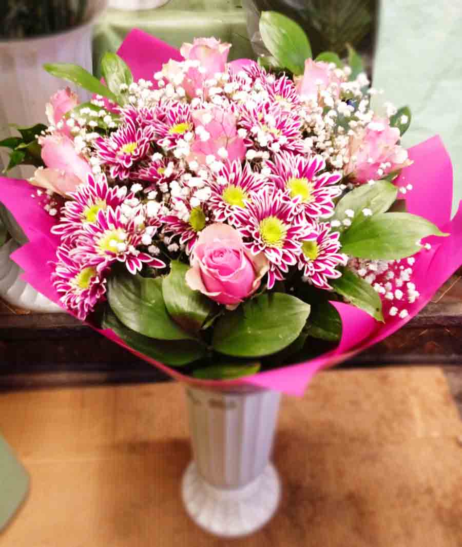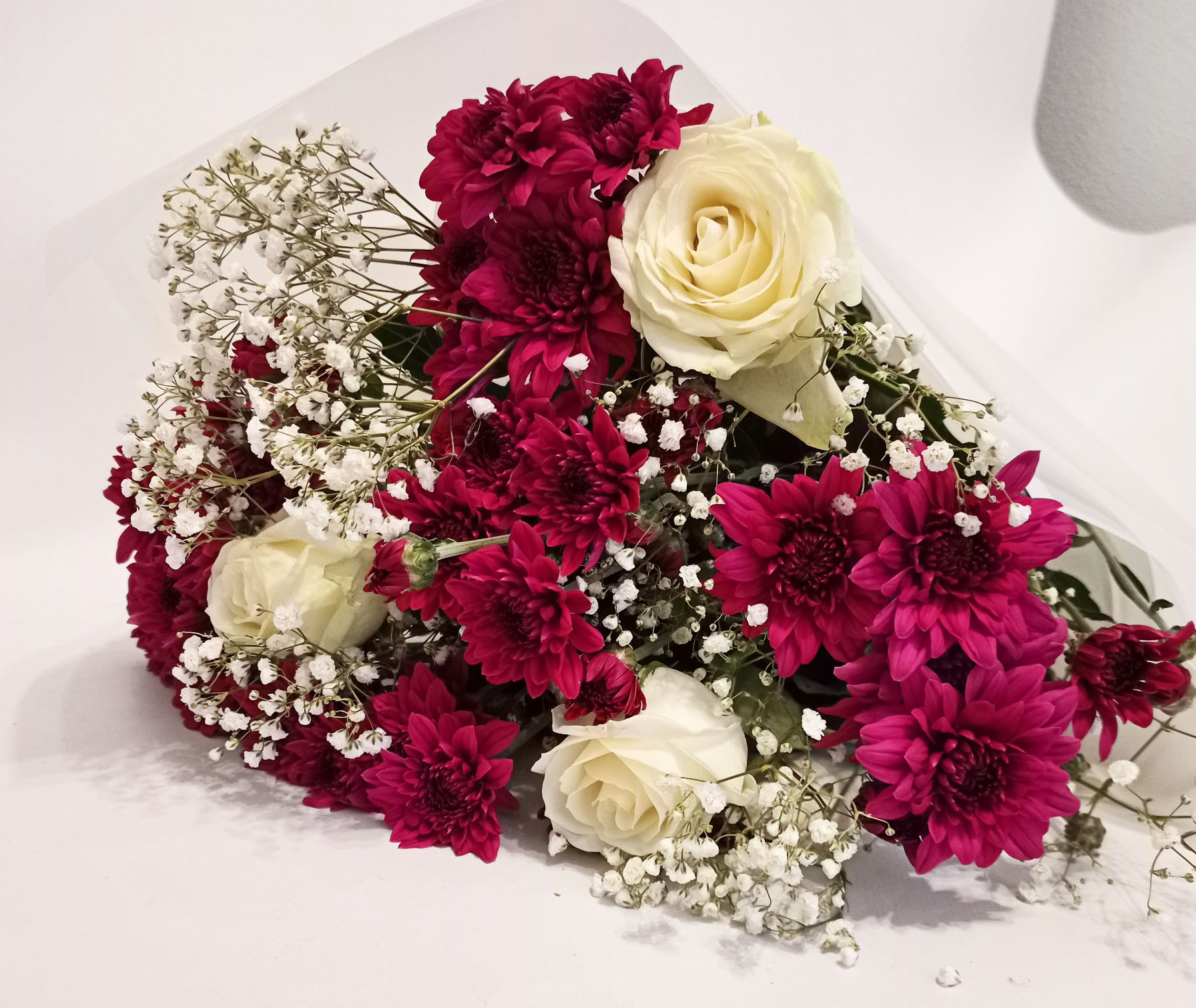 Small: 3 x Cream roses 4 x Chrysanthemums