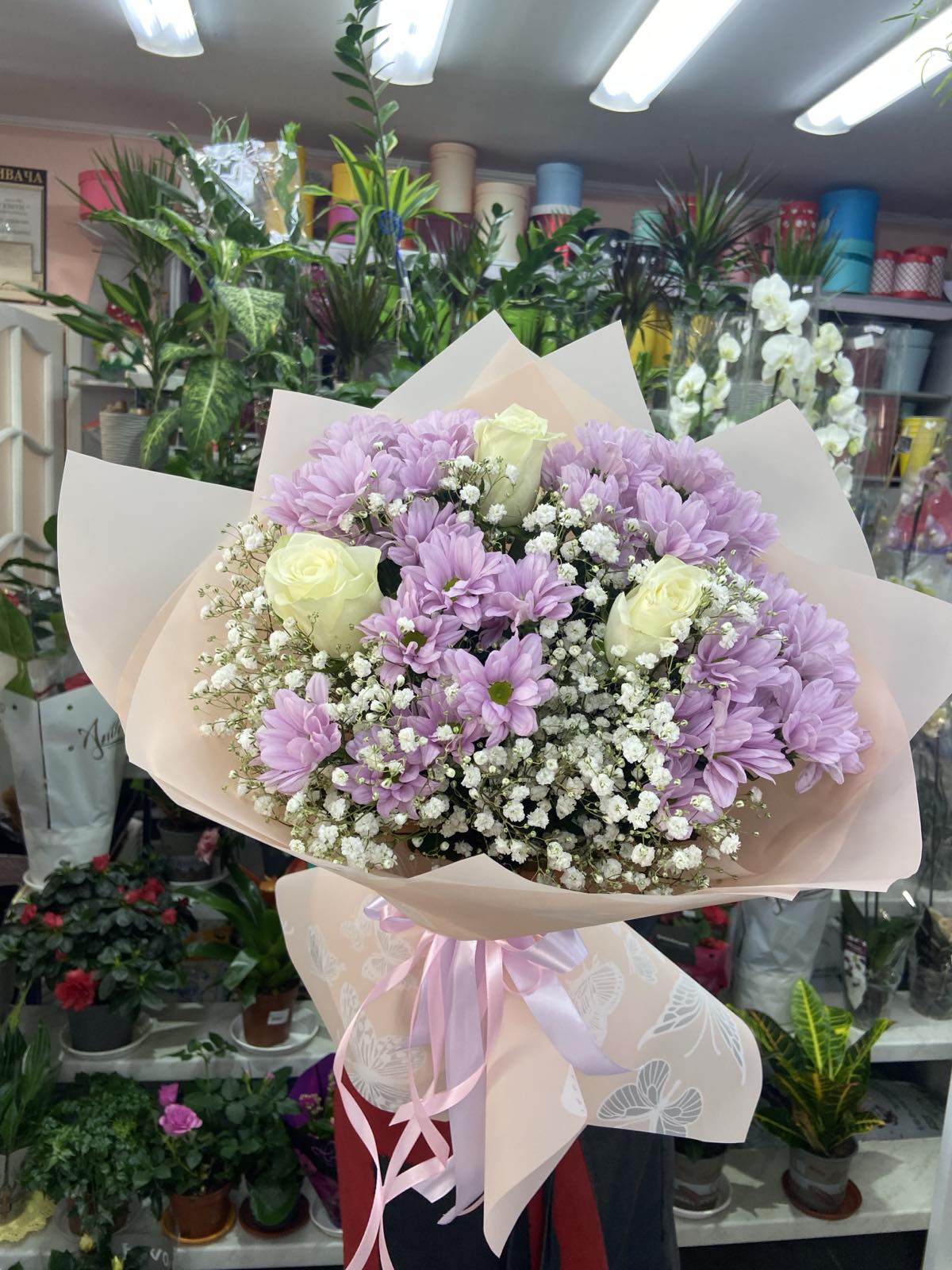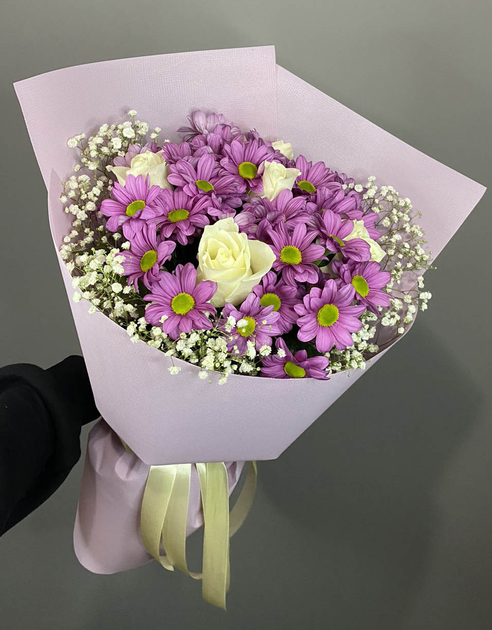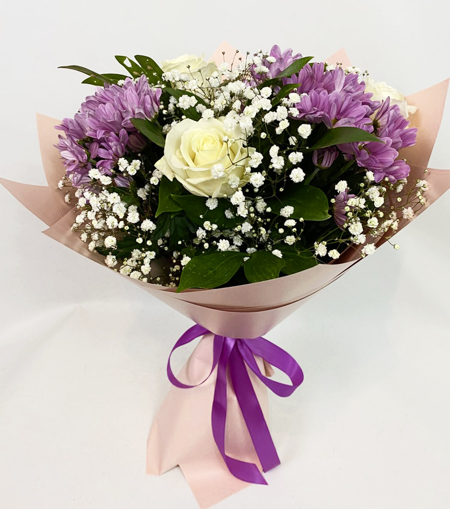 This bouquet at our photo is "Medium" option. It consists of 5 white or light peach roses, 5 violet chrysanthemums and ornamental foliage.