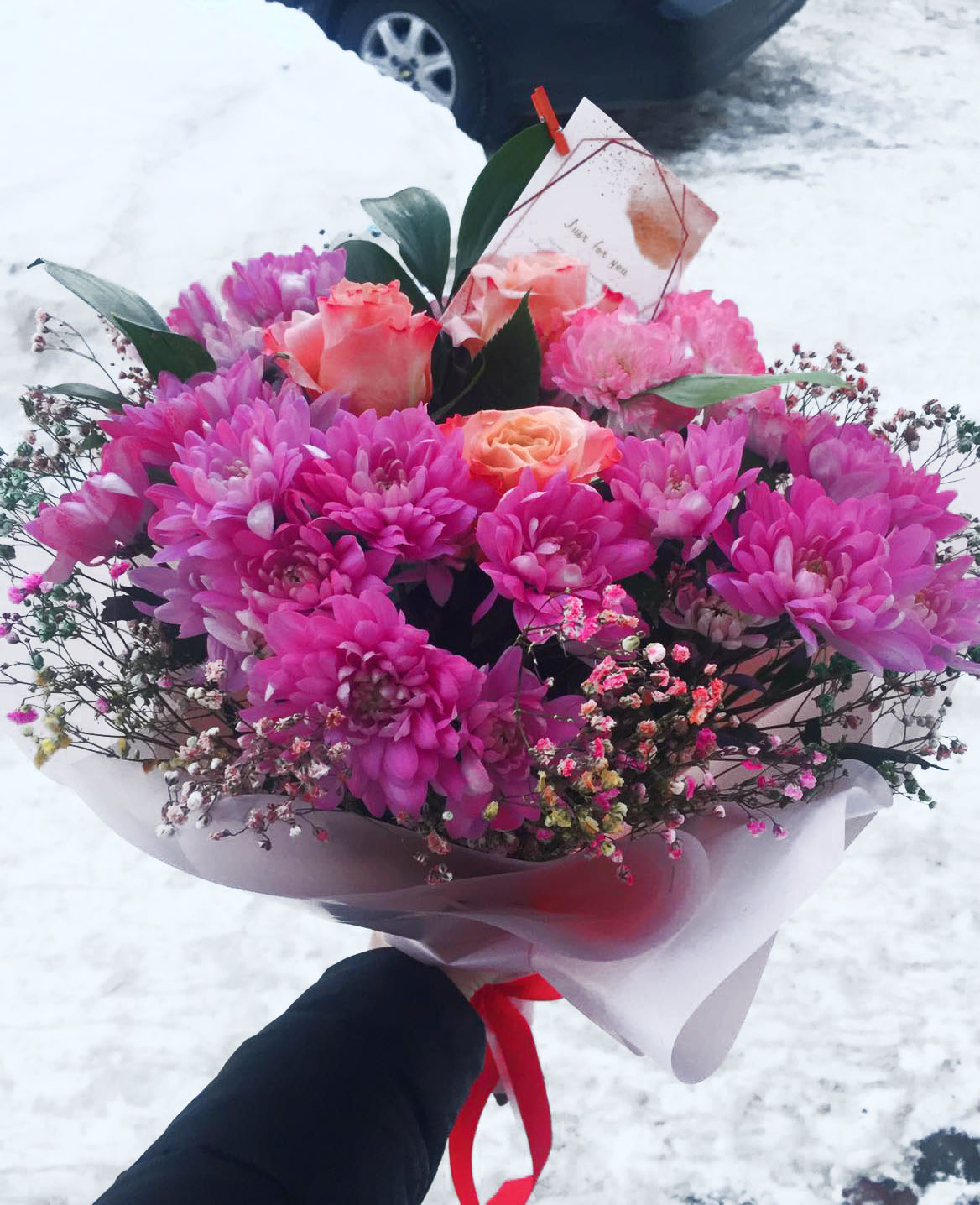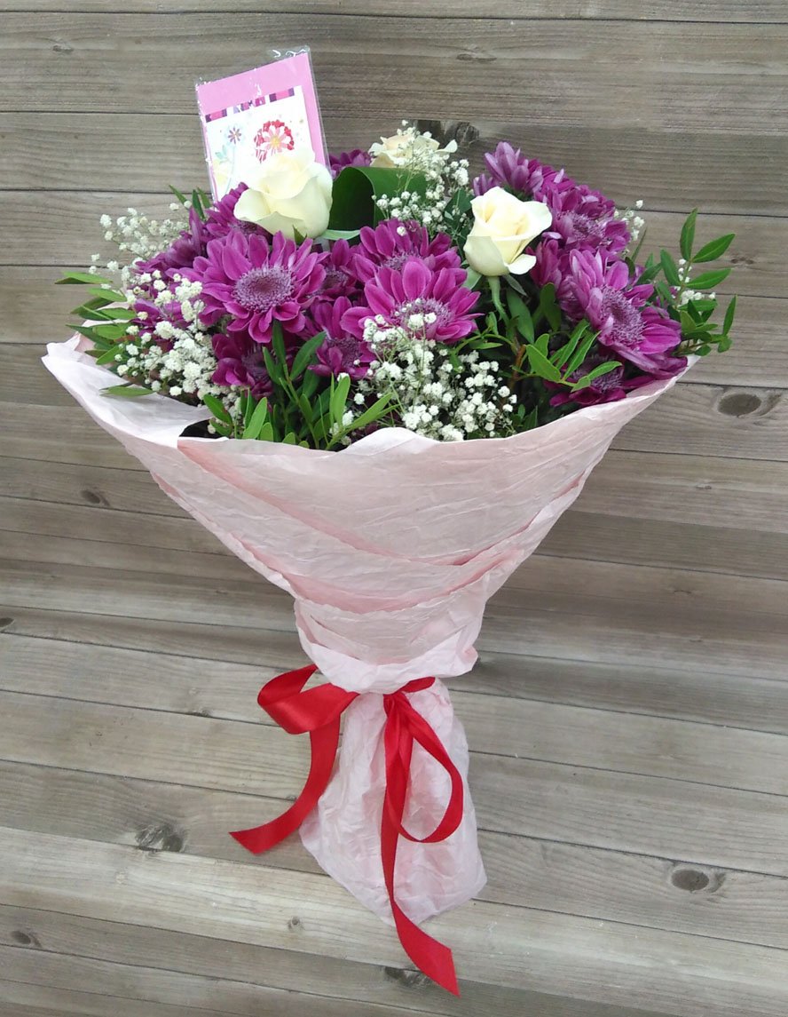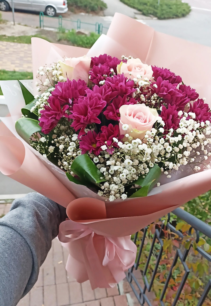 This bouquet at our photo is "Medium" option. It consists of 5 white or light peach roses, 5 violet chrysanthemums and ornamental foliage.