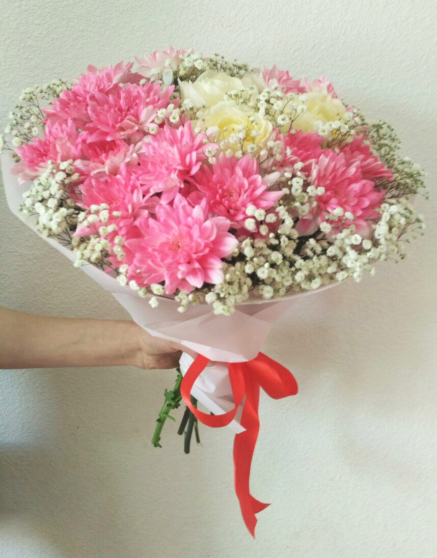 And, of course, to make the designing even more attractive we will add there white airy baby breath together with aspidistra leaves and other greenery. Nice lovely packing.