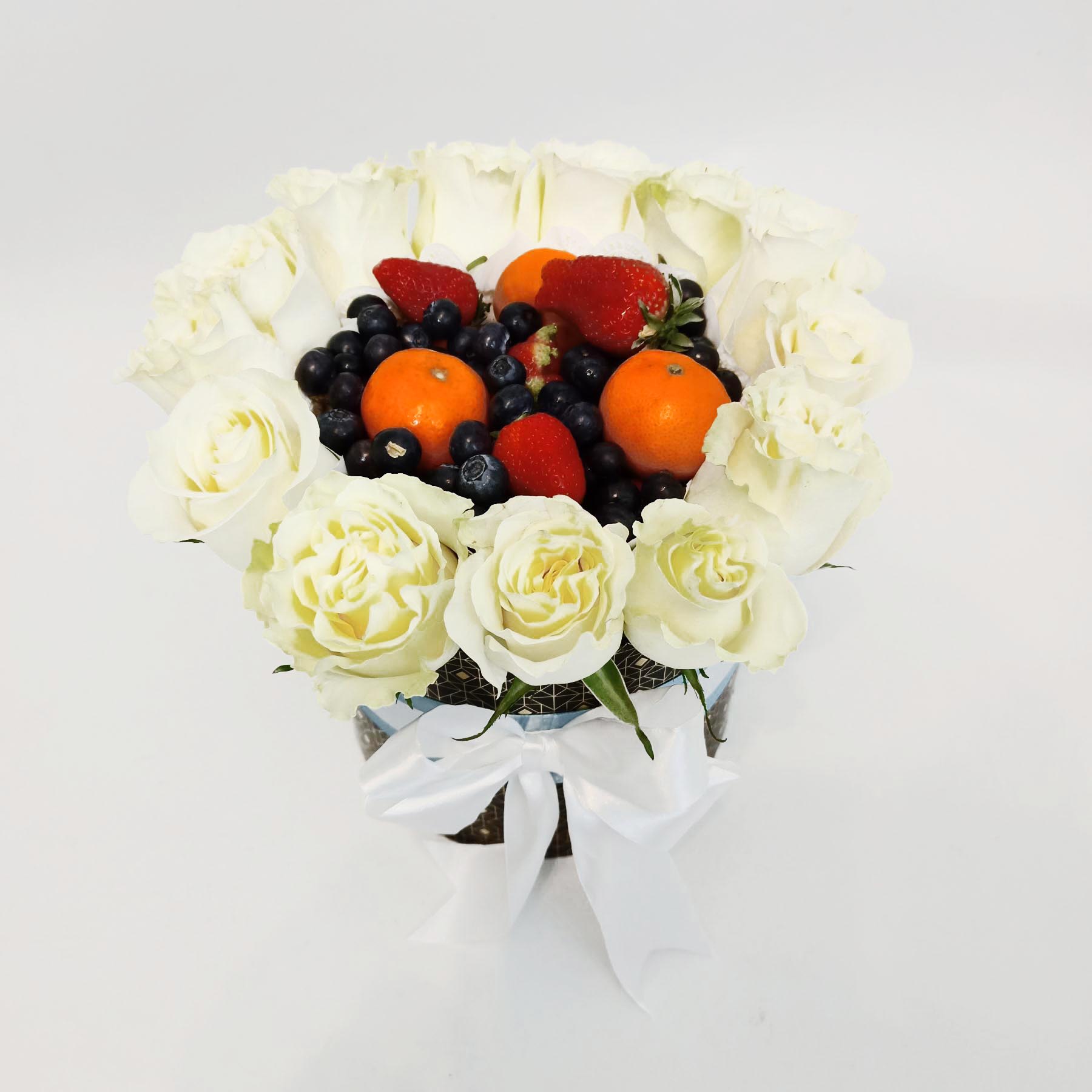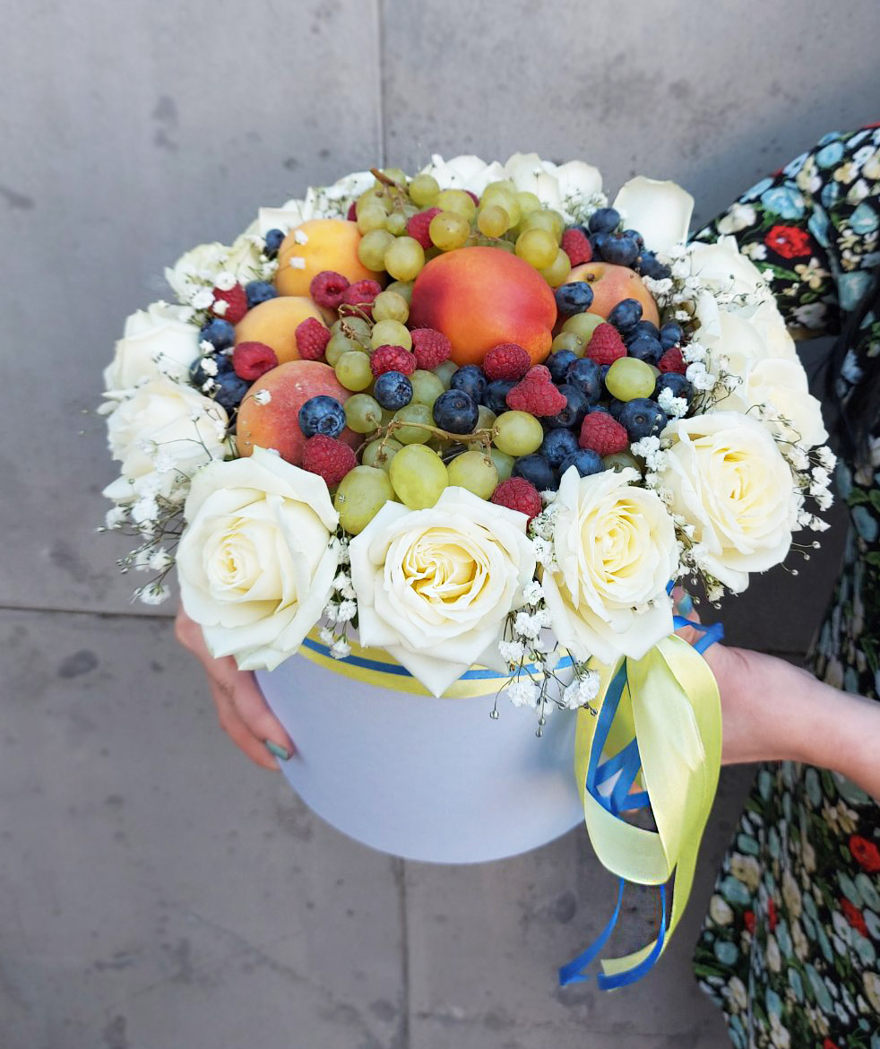 Our photo shows arrangement of 19 white roses with a set of mixed fruits and berries. However the size of the arrangement can be both bigger or smaller.