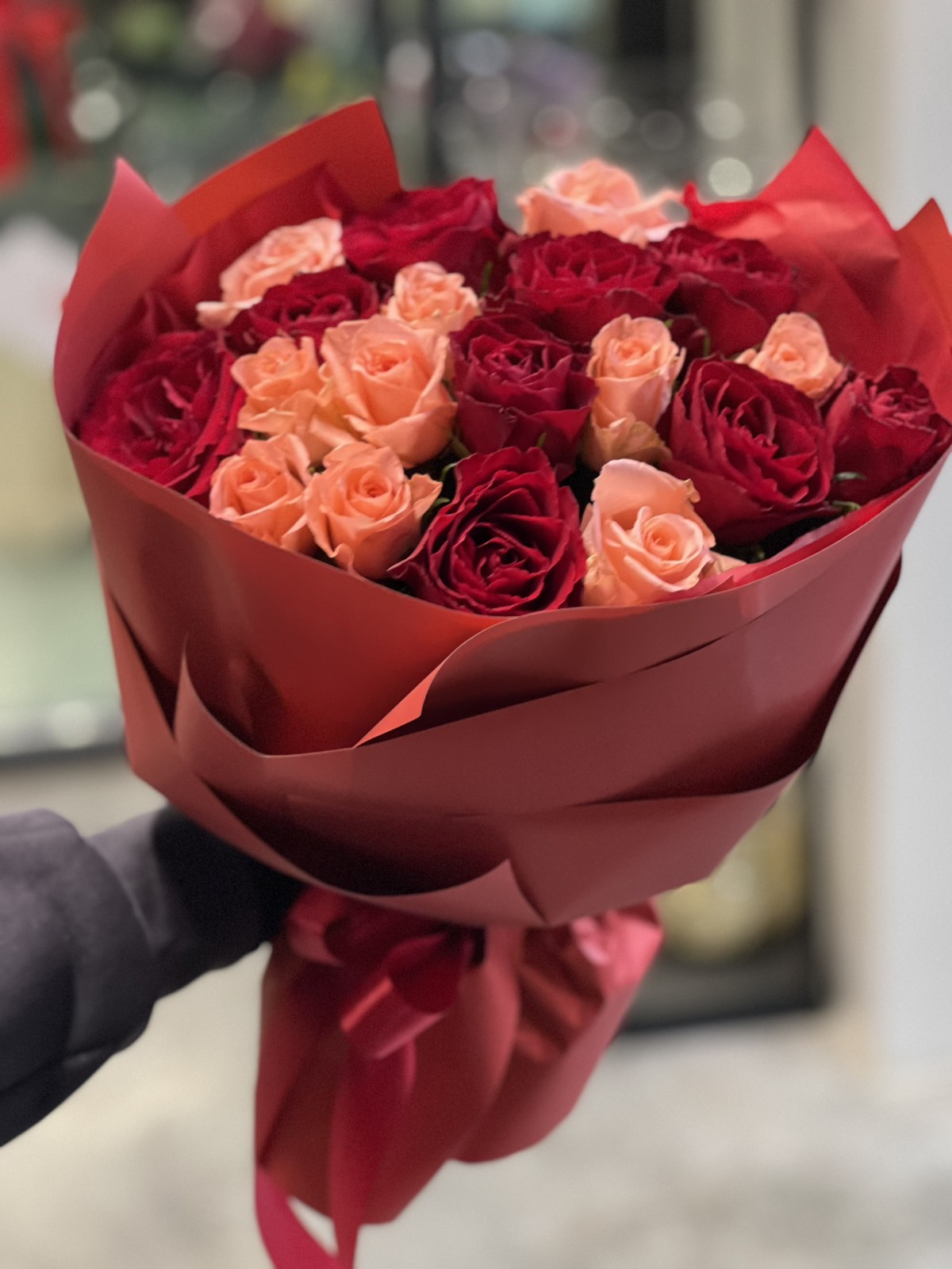 Red and Pink Classic Roses bouquet, arranged in floral paper with a satin bow.