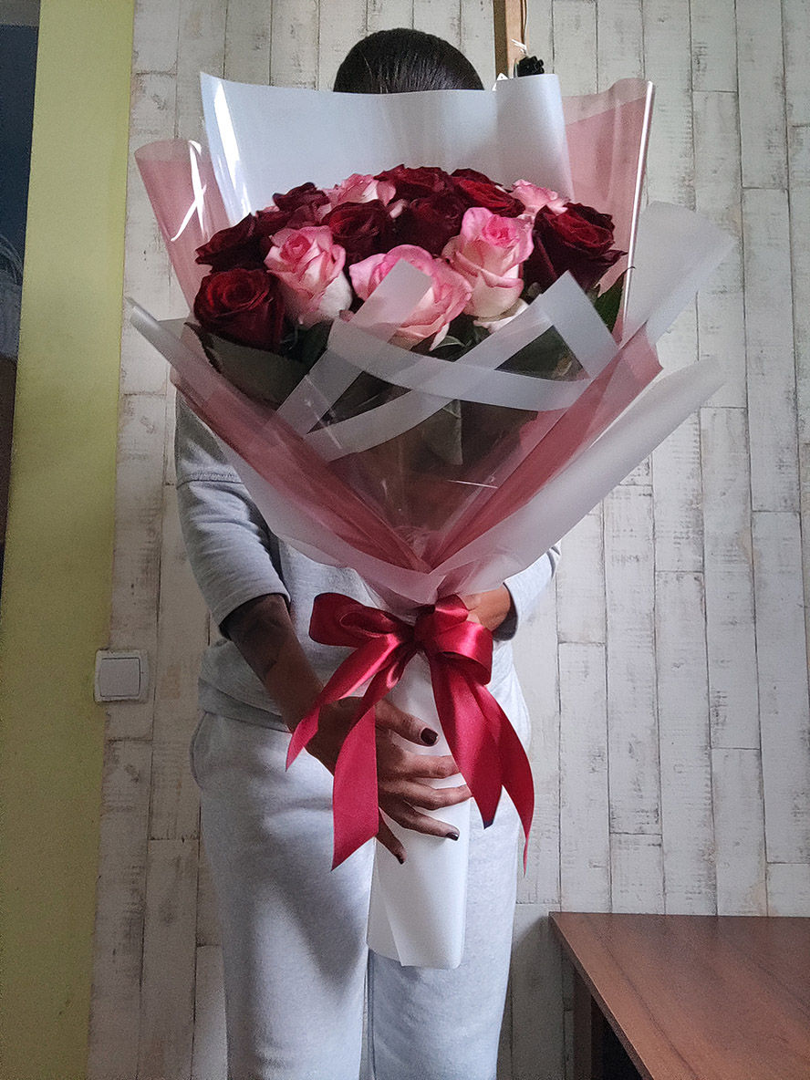 Our photo shows 51 Red & Pink Classic roses bouquet, but you might choose any other number.