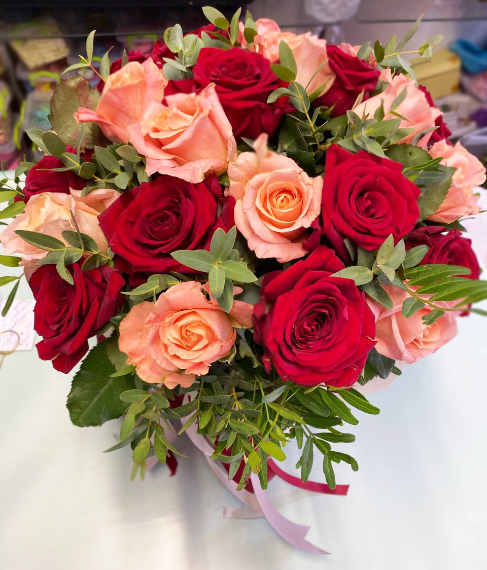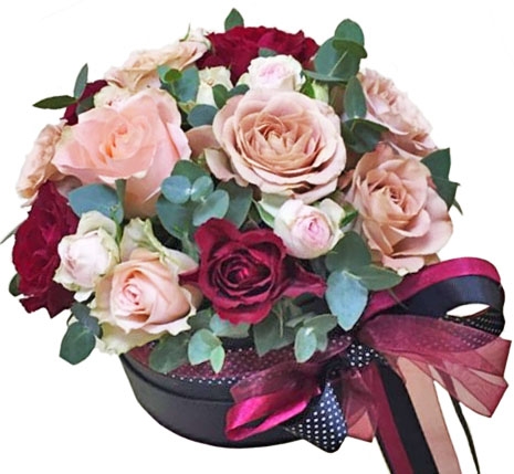 A Hat box arrangement of red and pink roses with eucalyptus and other foliage.
