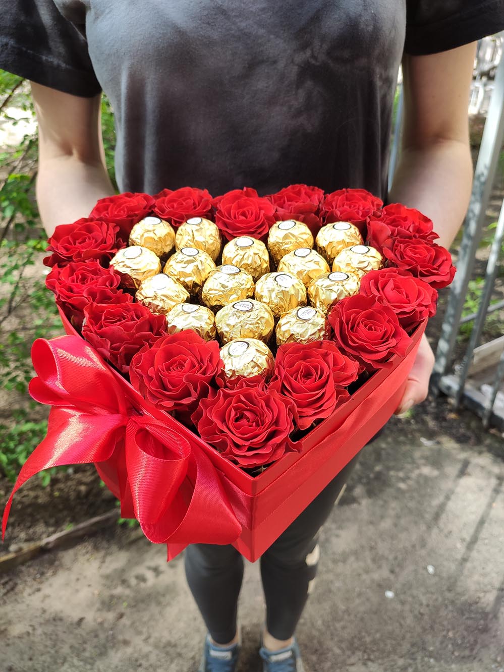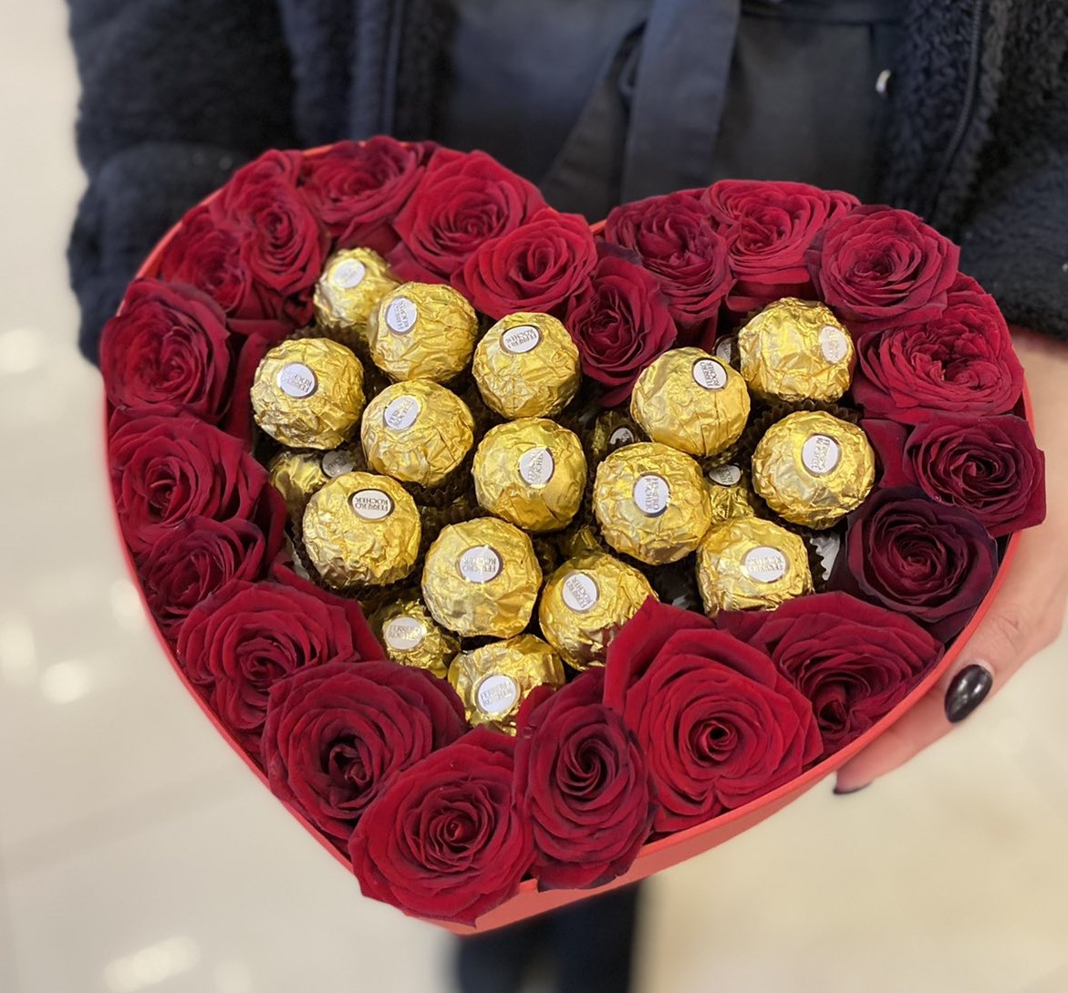 Red roses & Ferrero Rocher chocolates heart shaped arrangement.