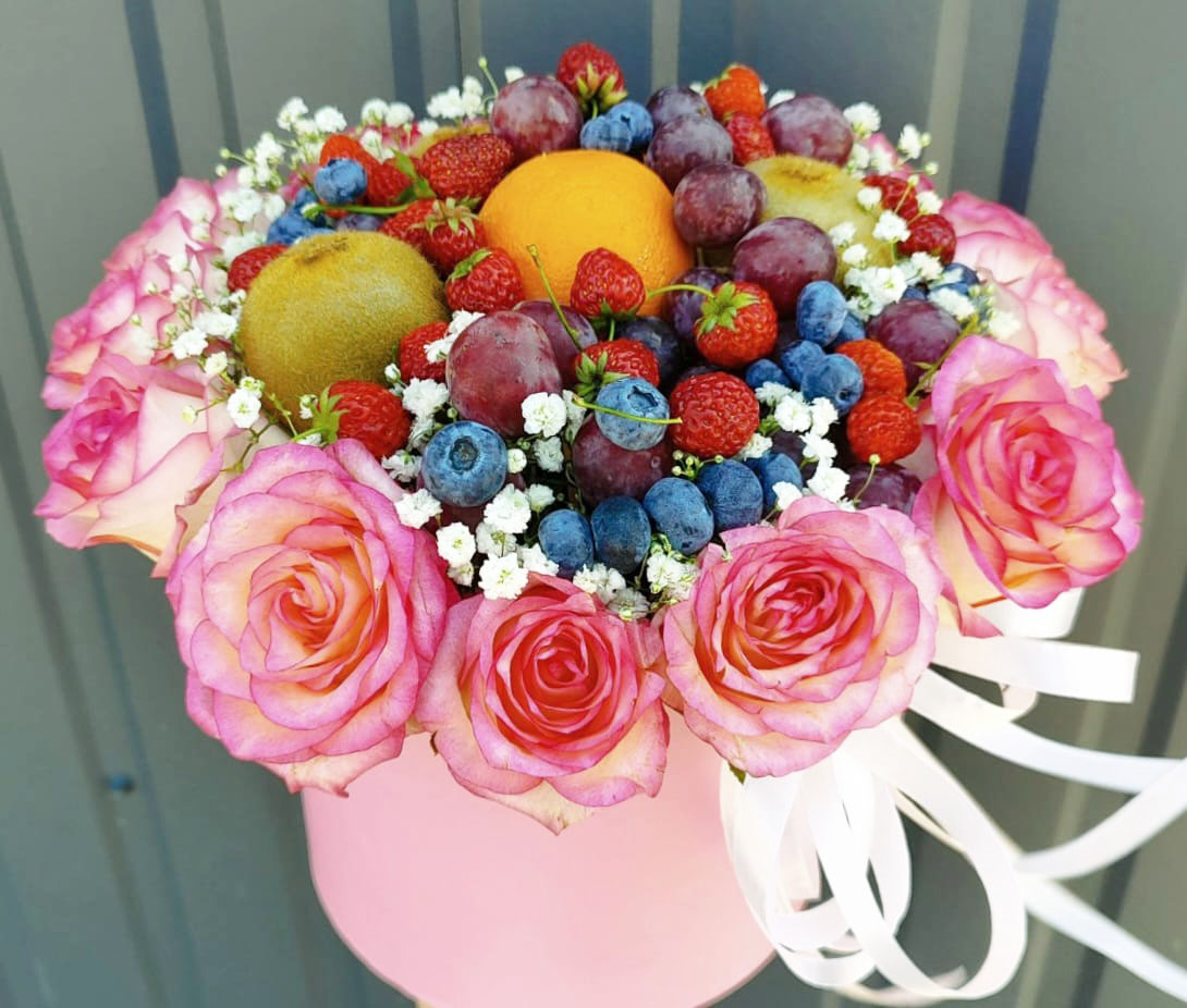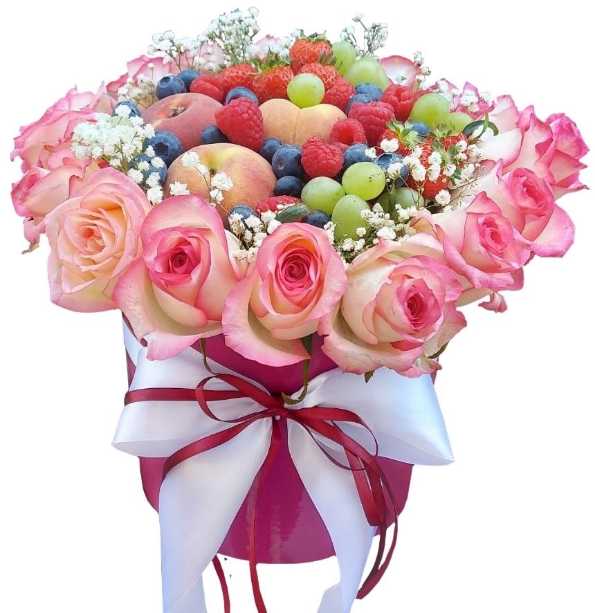 Our photo shows arrangement of 15 white roses with a set of mixed fruits and berries. However the size of the arrangement can be both bigger or smaller.