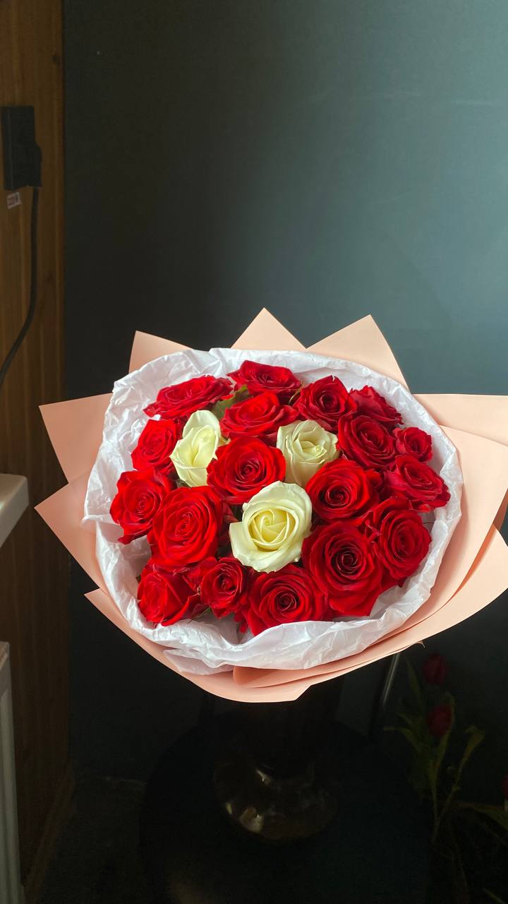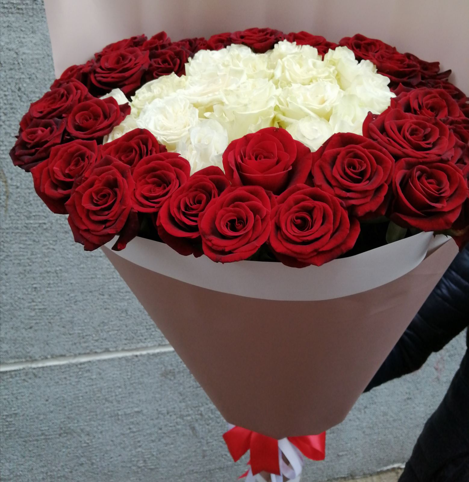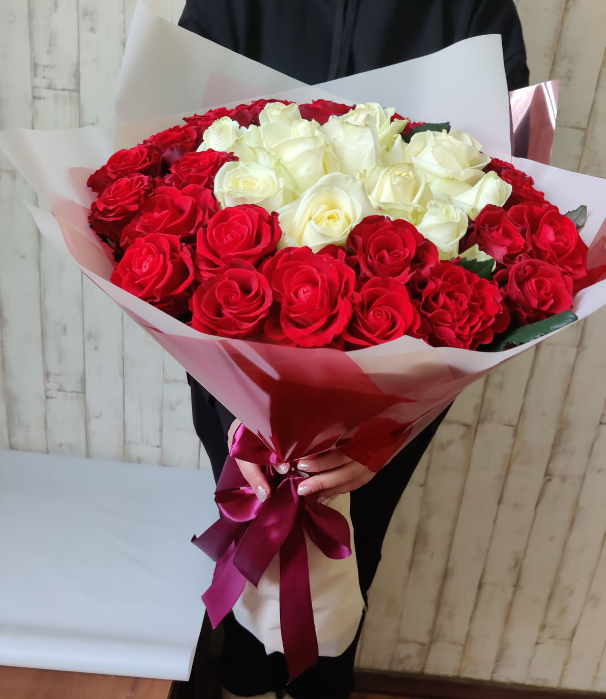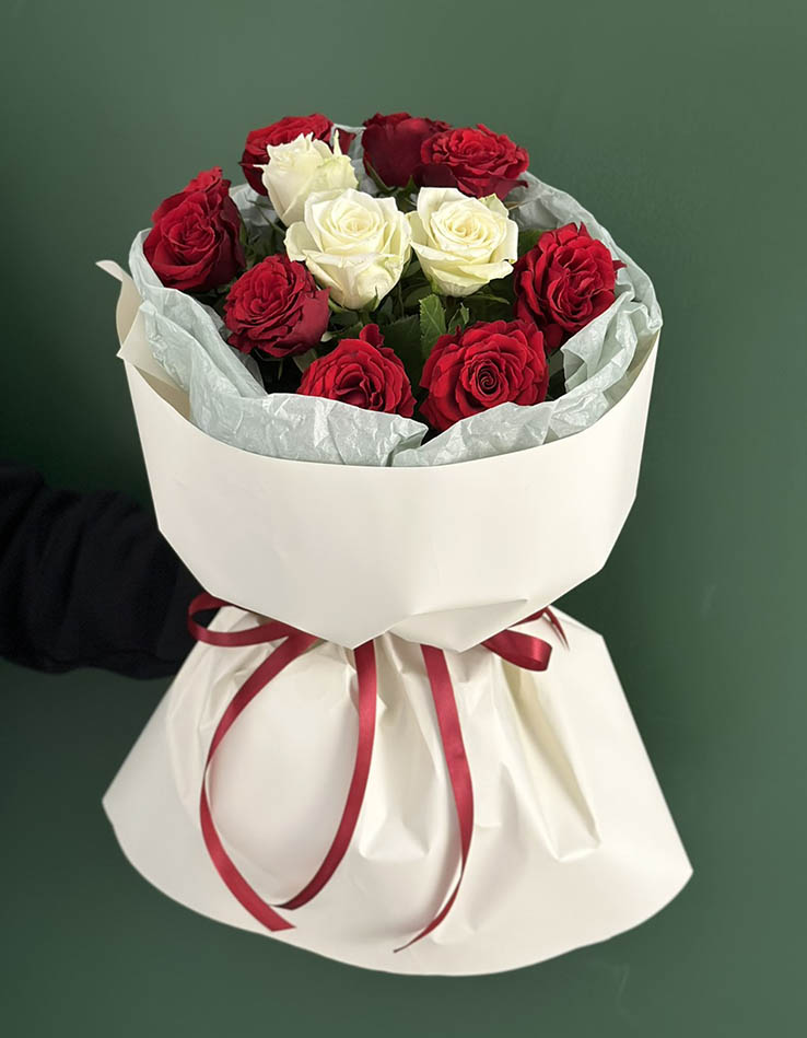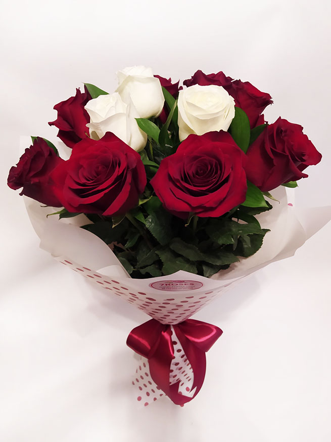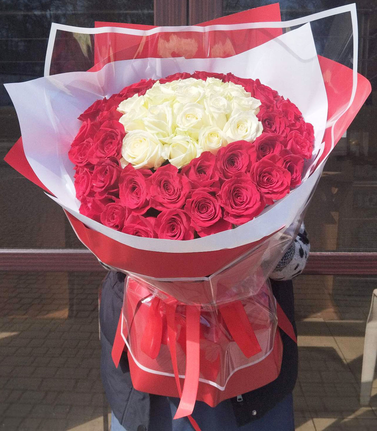 Stunning round bouquet of the Classiс Red and White roses in the center. Special original bouquet design.Decorated with greenery, foliage, nice packing and red ribbon