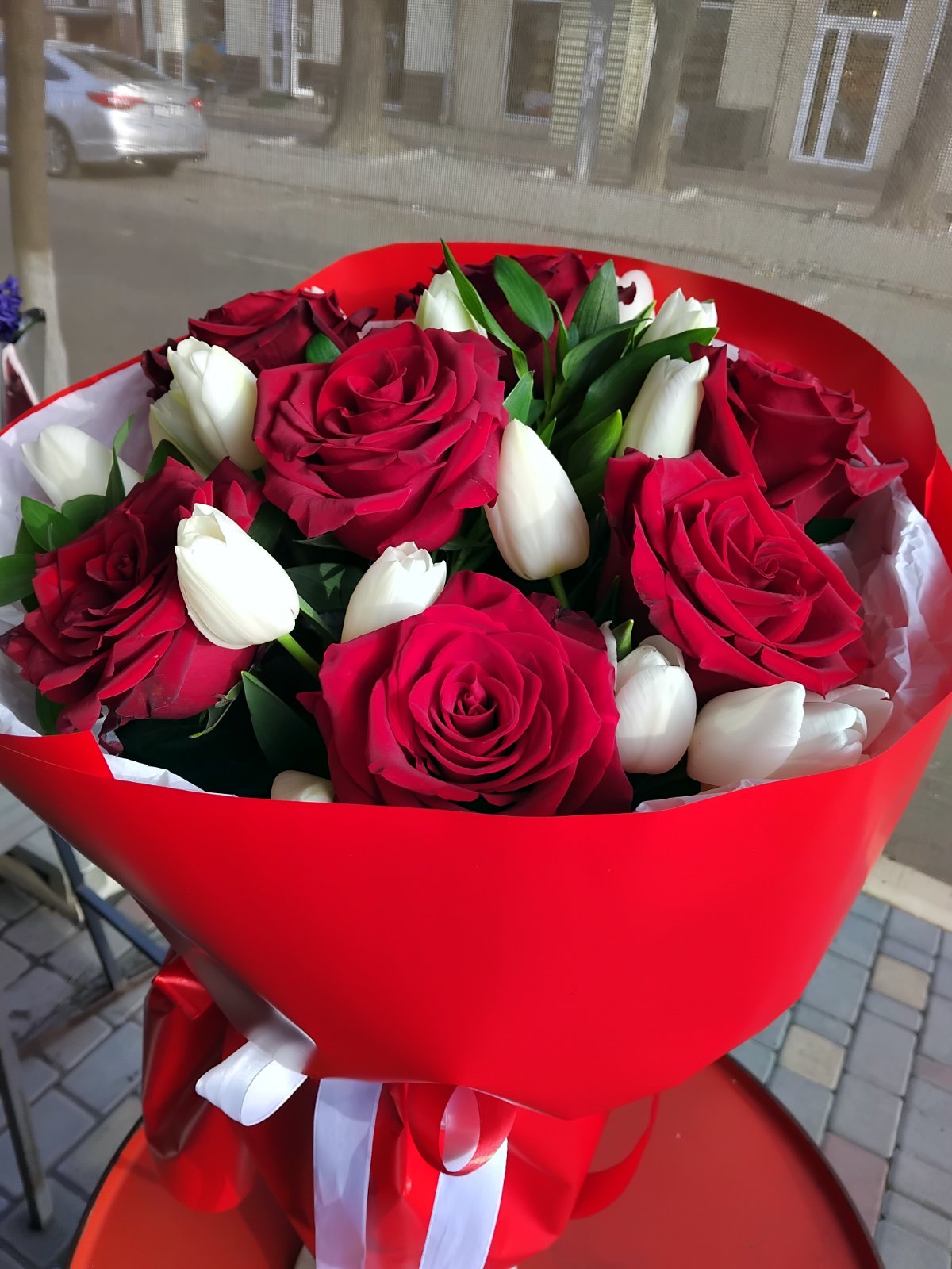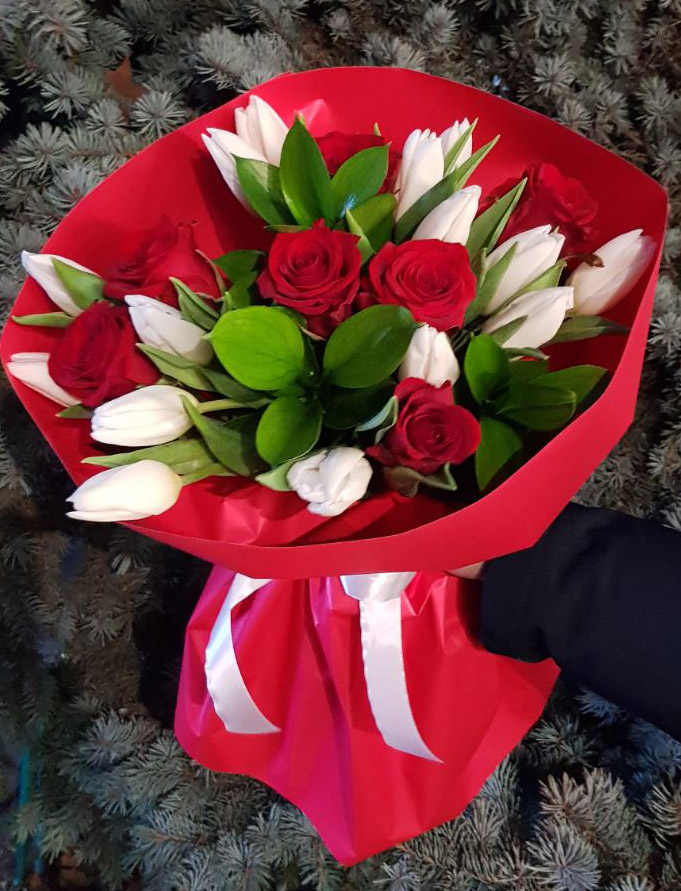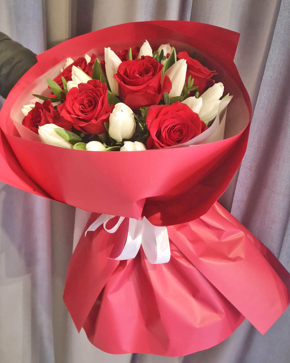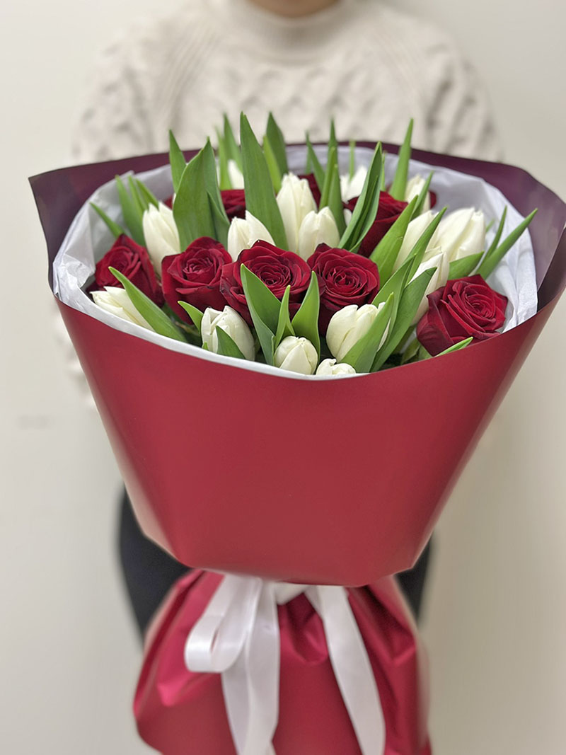 IMPORTANT : Bouquet of Bright Red or Crimson Roses and White Tulips is available apprx from January-February to April - at the tulips blossoming season. White tulips will be substituted with other cute white flowers if this bouquet is ordered at the other seasons.