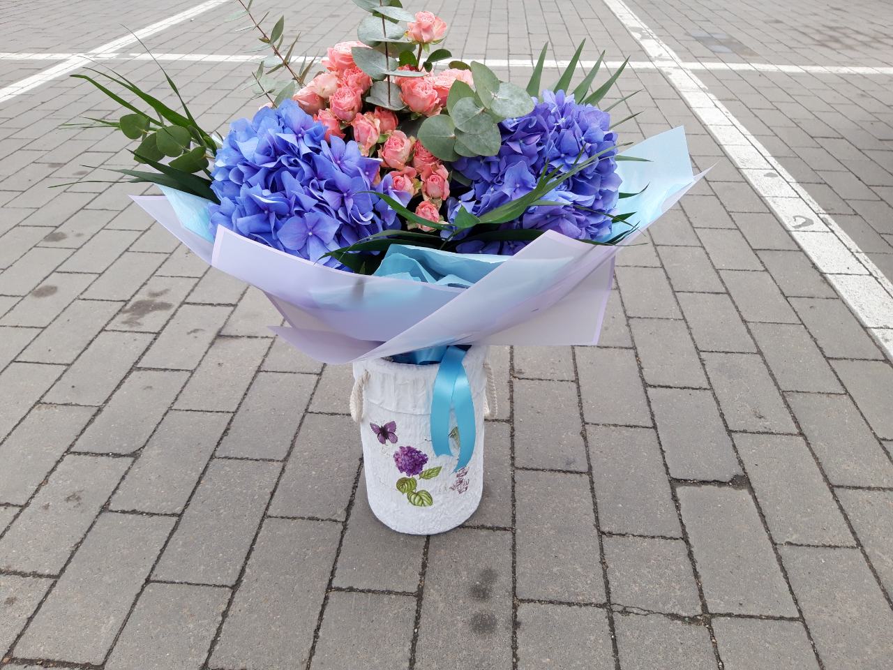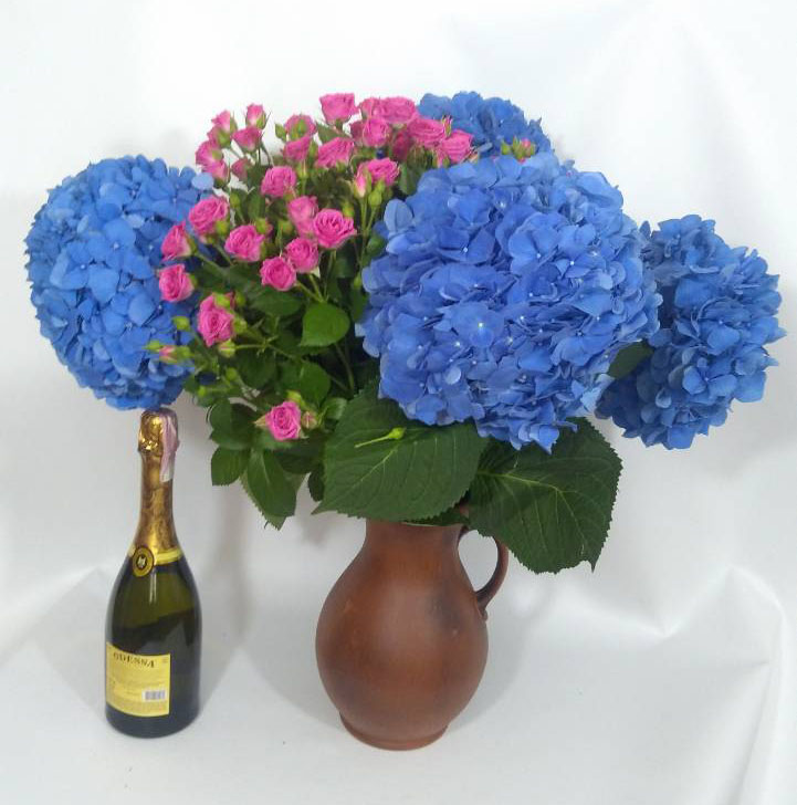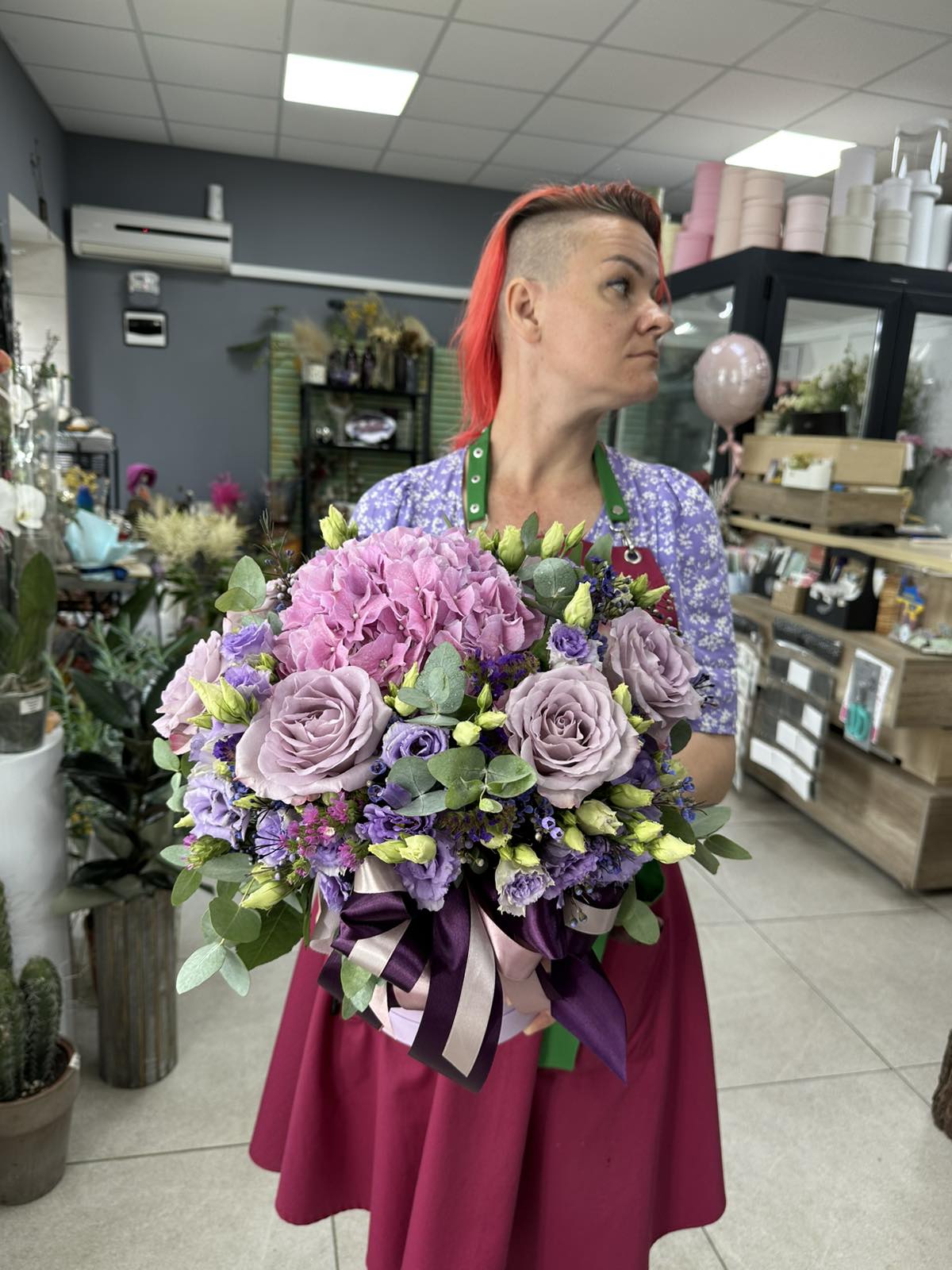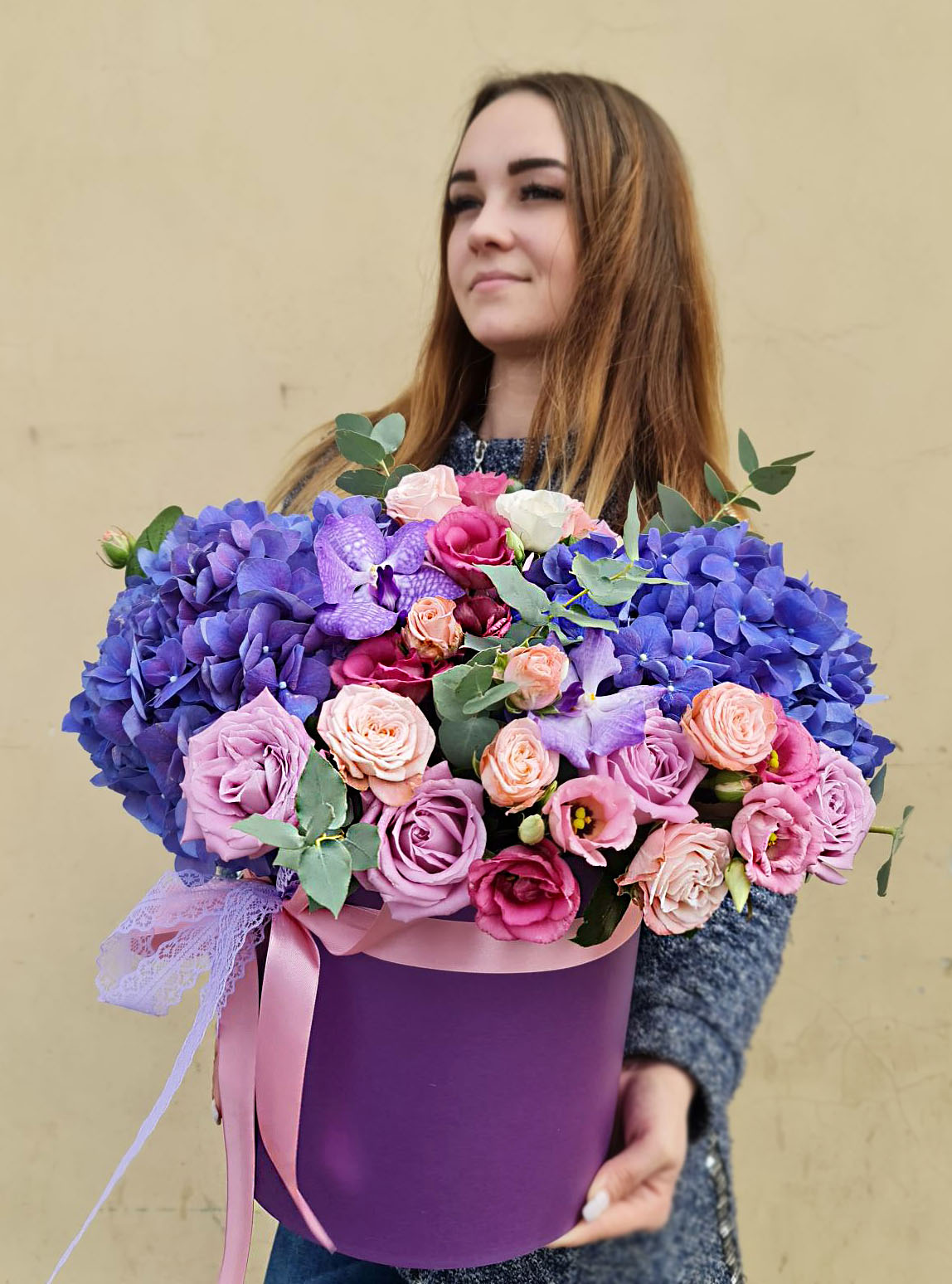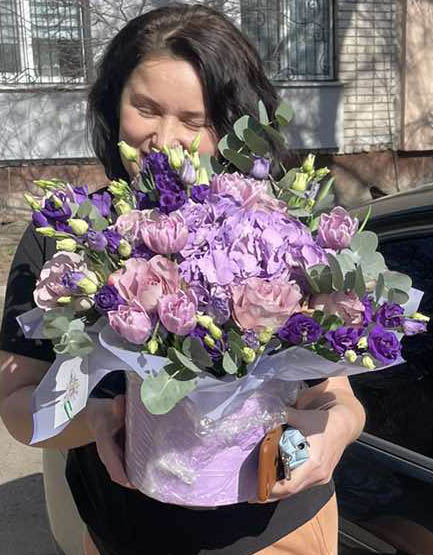 The content of this arrangement is "approximate" because we get flowers of such colors not very often from the suppliers and every day the flowers availability changes at the flower shops. So, some flowers from trhe list might be substituted with other flowers, for example, we might have a liluc Hydrangea at some days, so, we might take it instead of a purple tulips. Anyway we'll do our best selection of flowers to make this unusual arrangement.