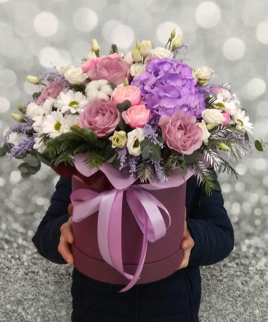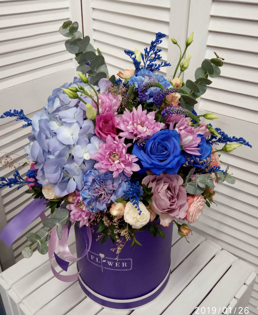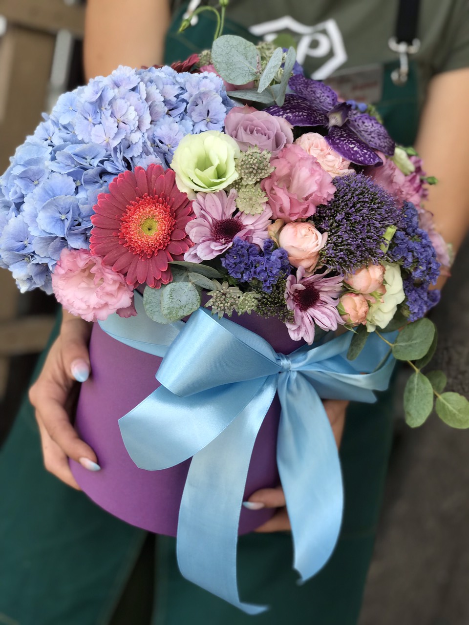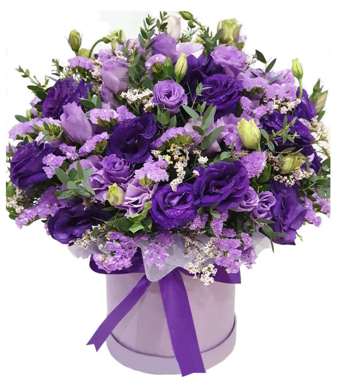A flower arrangement of lilac and purple flowers in a hat-box looks royal showy.
