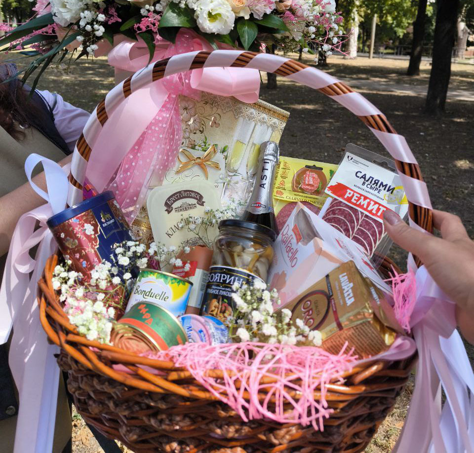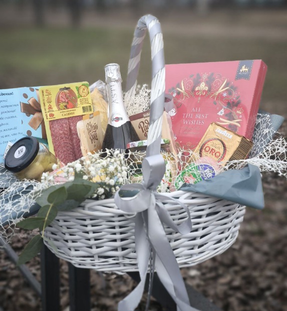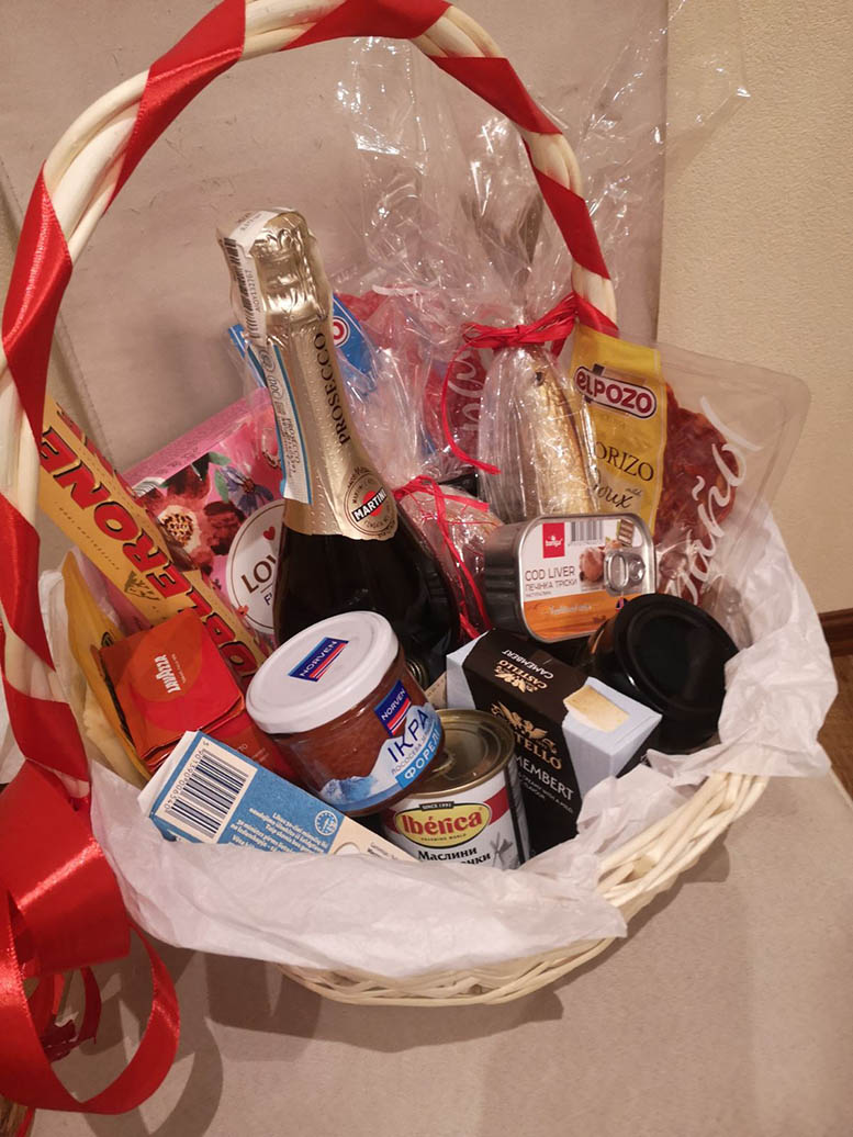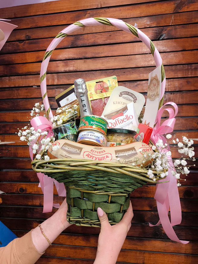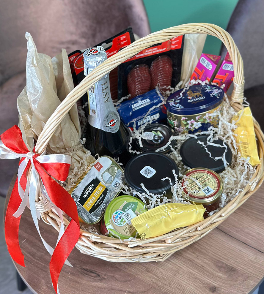 Все деликатесы будут уложены в корзину из плетеной лозы, подарочную коробку или подарочный деревянный ящик - по наличию упаковки в нашем магазине на момент получения вашего заказа.