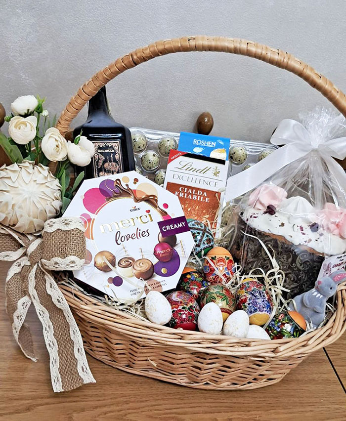 В эту подарочную пасхальную корзину входят самые традиционные и вкусные для этого события вещи: