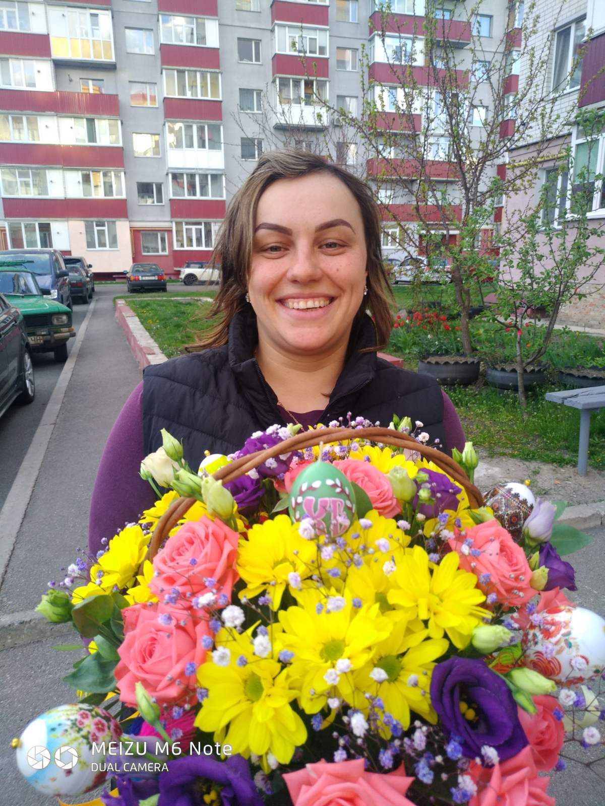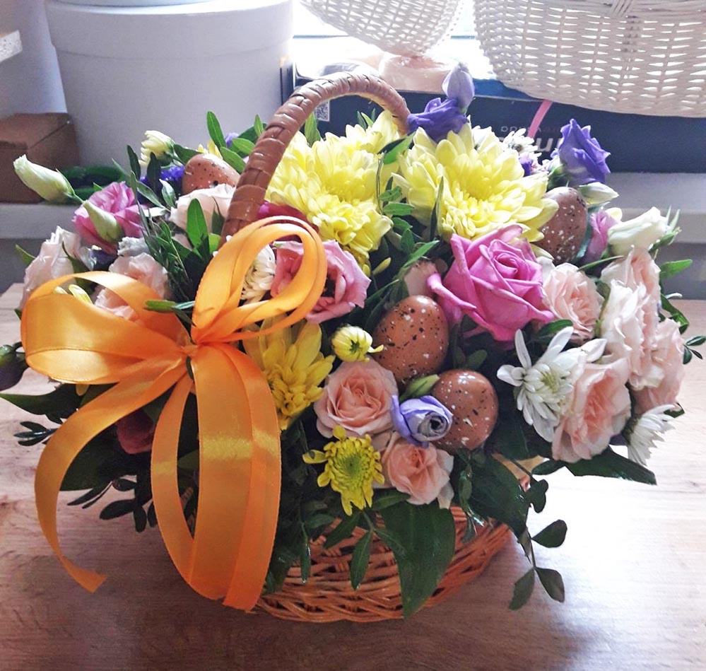 Прекрасная, светлая, как сам этот чудесный день, корзина цветов в теплых тонах: розовых, желтых, голубых).