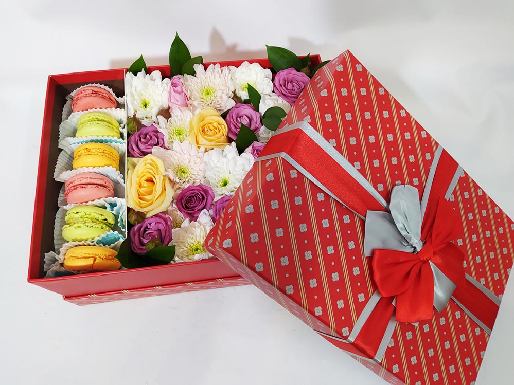 Удивительный ковер из свежих и прекрасных цветов в большой подарочной коробке соседствует с вкуснейшими французскими Макарунами (или Макаронс).