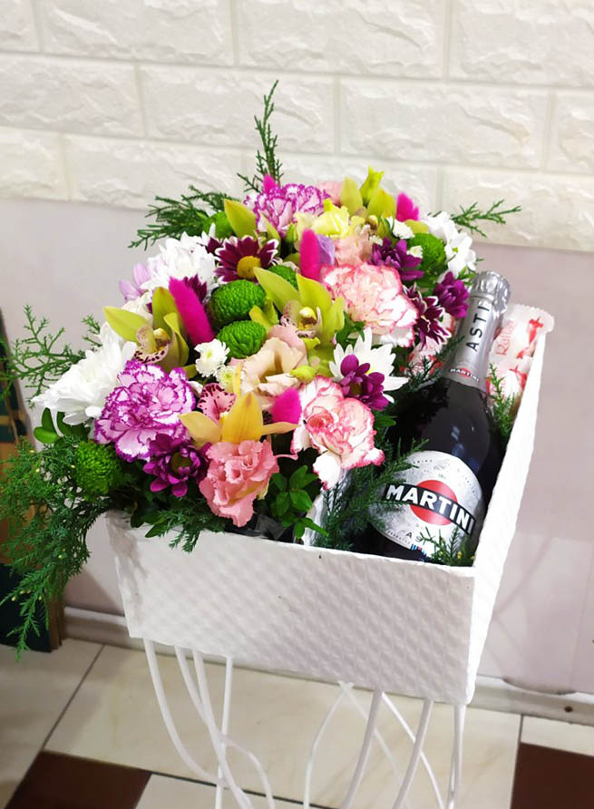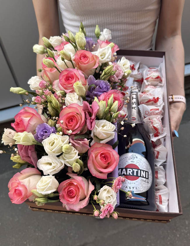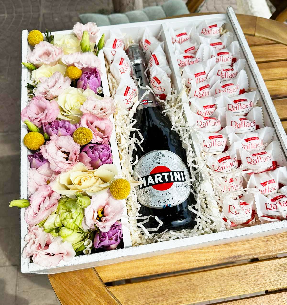 Роскошный подарок включает бутылку прекрасного Мартини, 30 неповторимых конфет Рафаэлло, композицию из сезонных цветов.