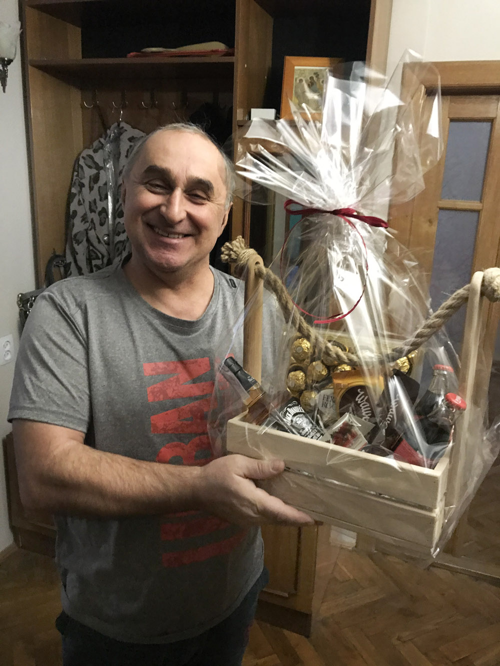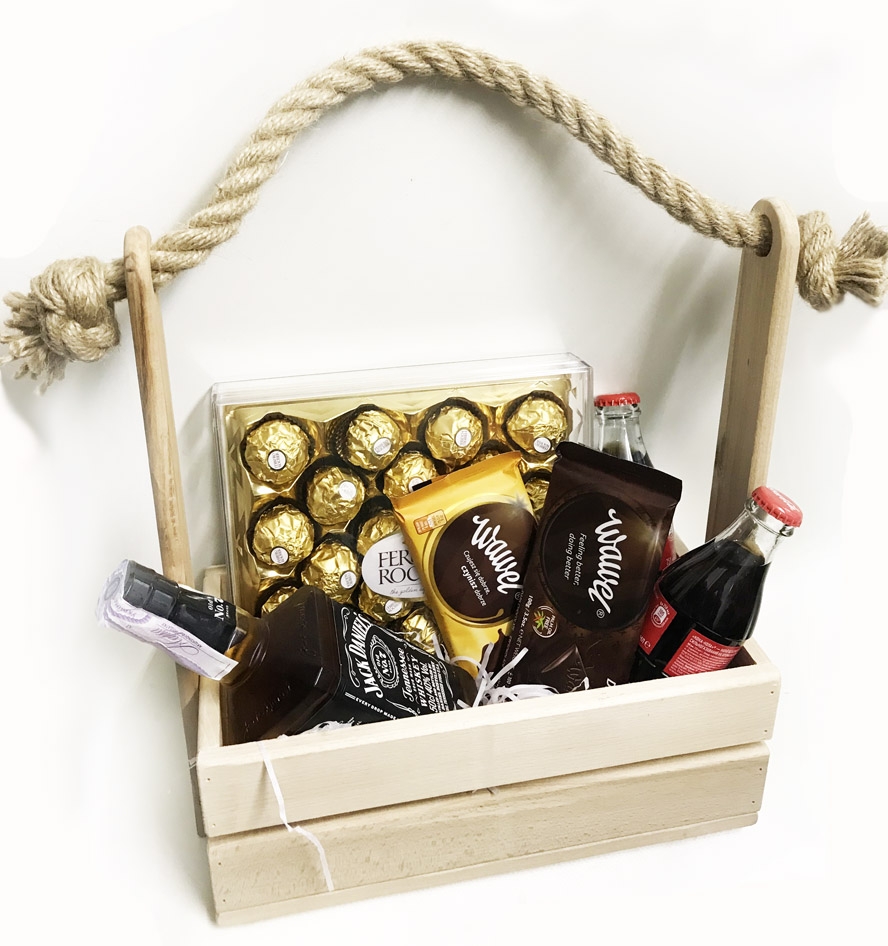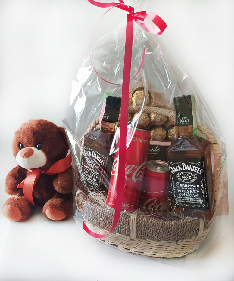 1 x Джек Дениелс 0,5л 2 x бут. Кока-Колы, 0,25л 2 x импортные шоколадки, 100 гр 1 х коробка Ферреро Роше 260-300 гр. Корзинка, декор