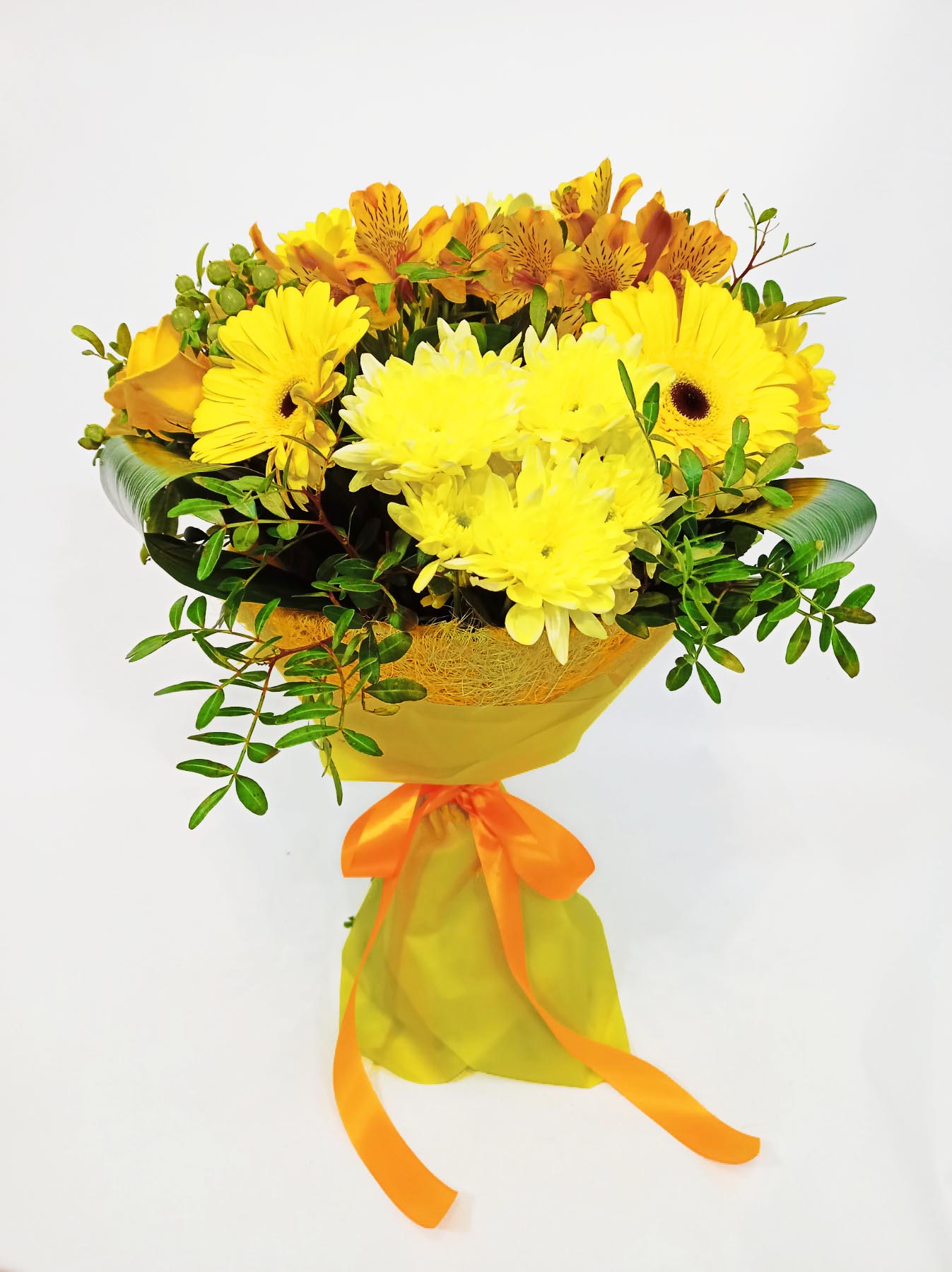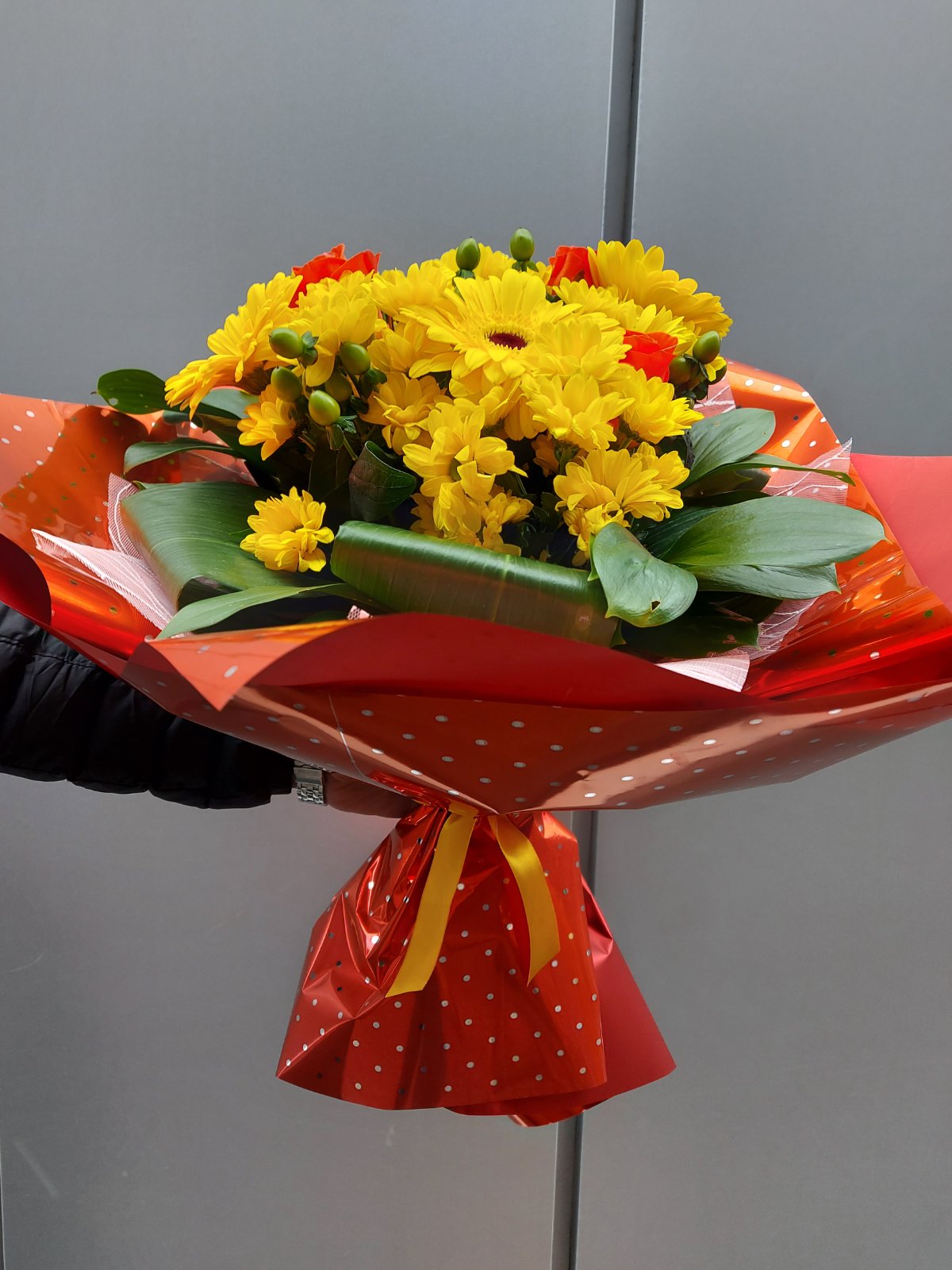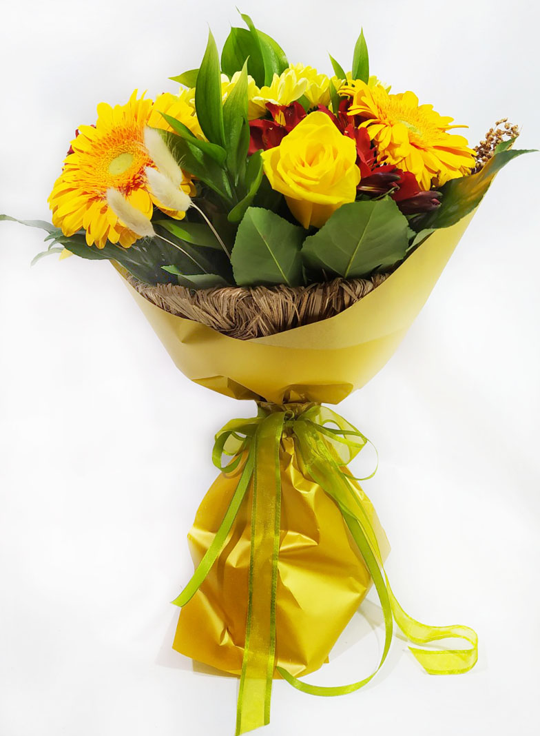Солидаго, краспедия, аспидистра, другая зелень завершает композицию. Ее упаковка и бант тоже подчиняются общей идее.