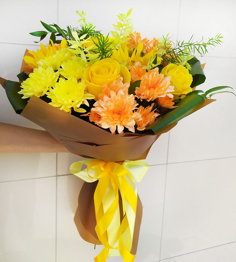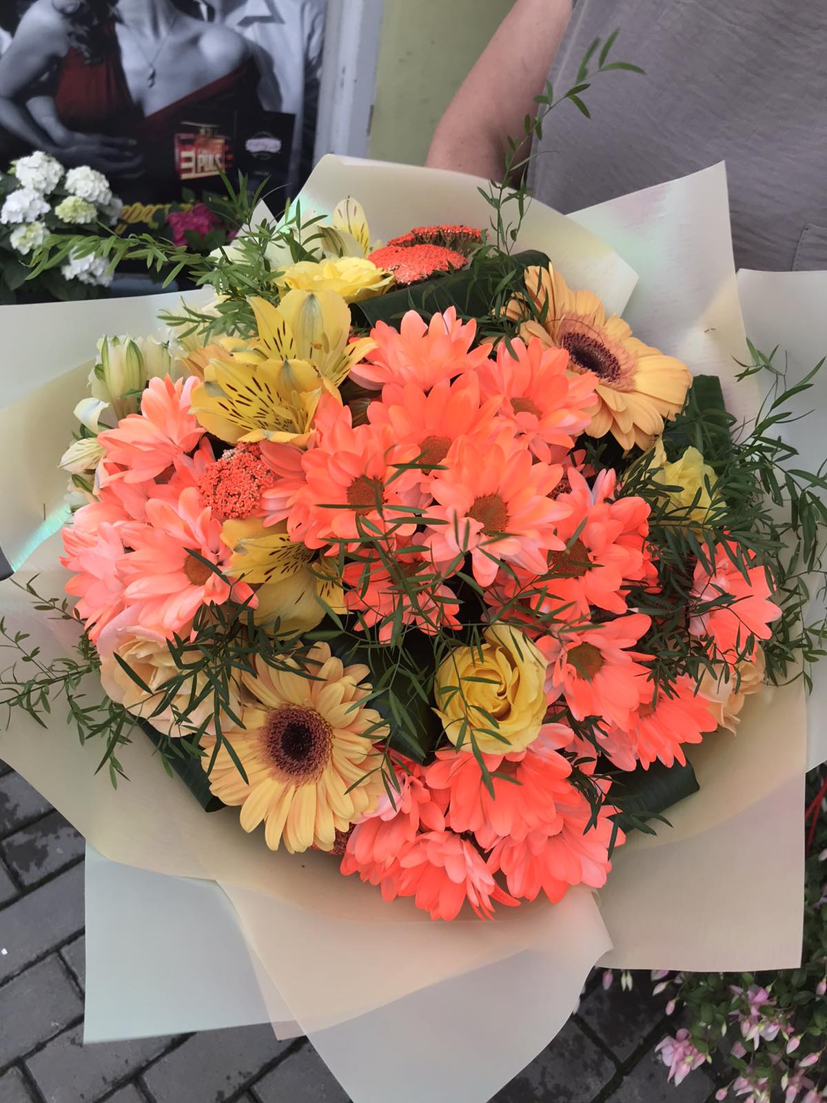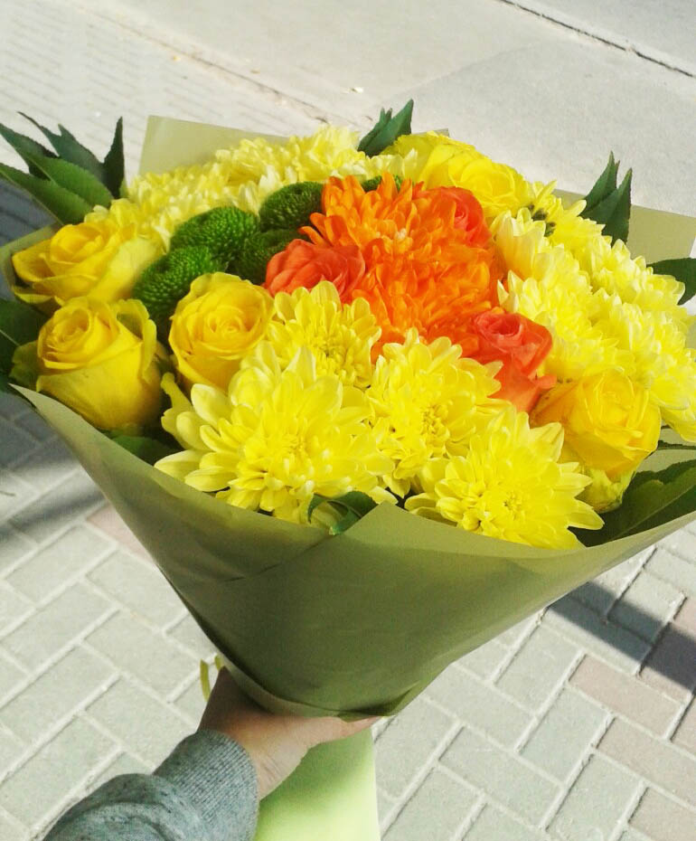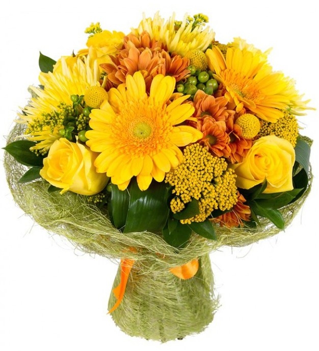 Здесь только желтые и оранжевые цветы. И какой же букет без дизайнерского наполнения специальными декоративными растениями?