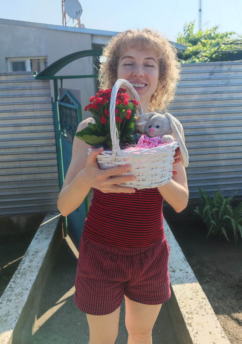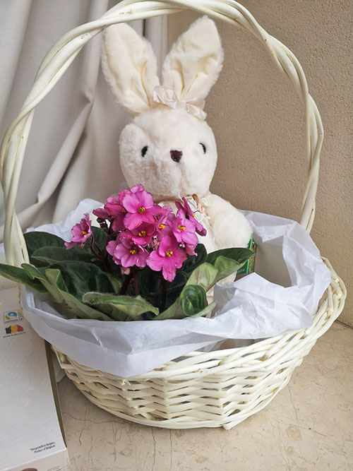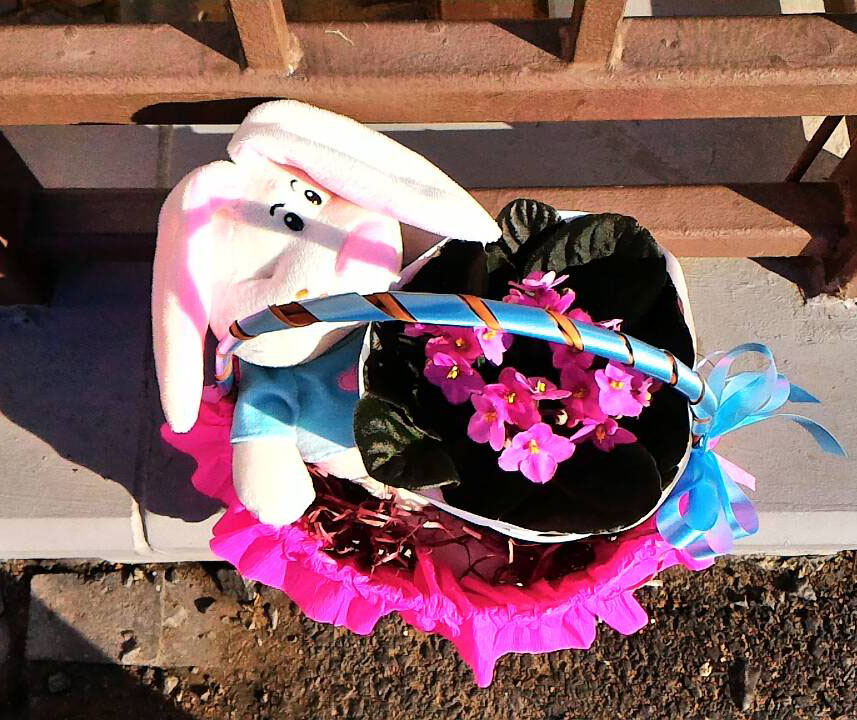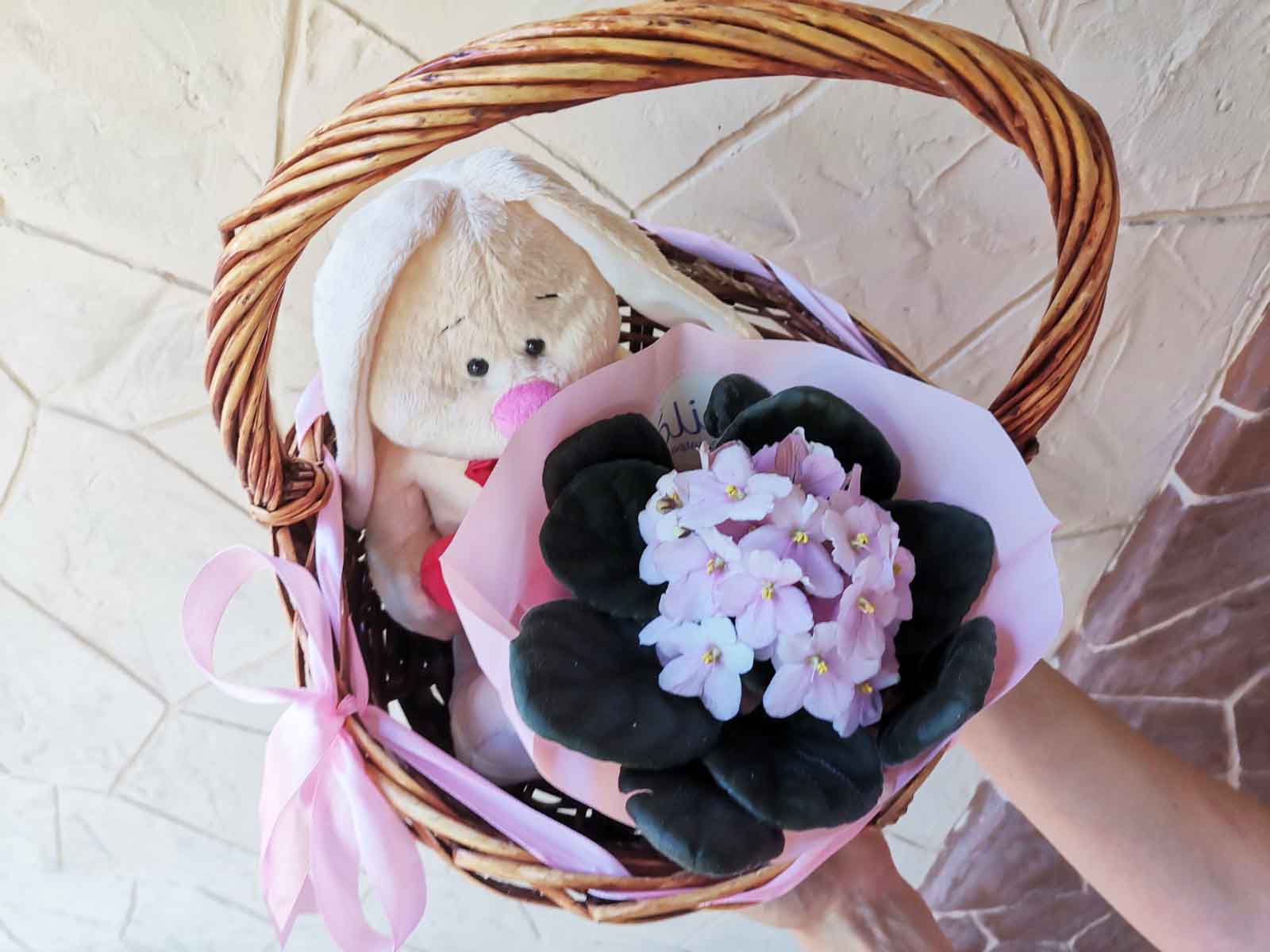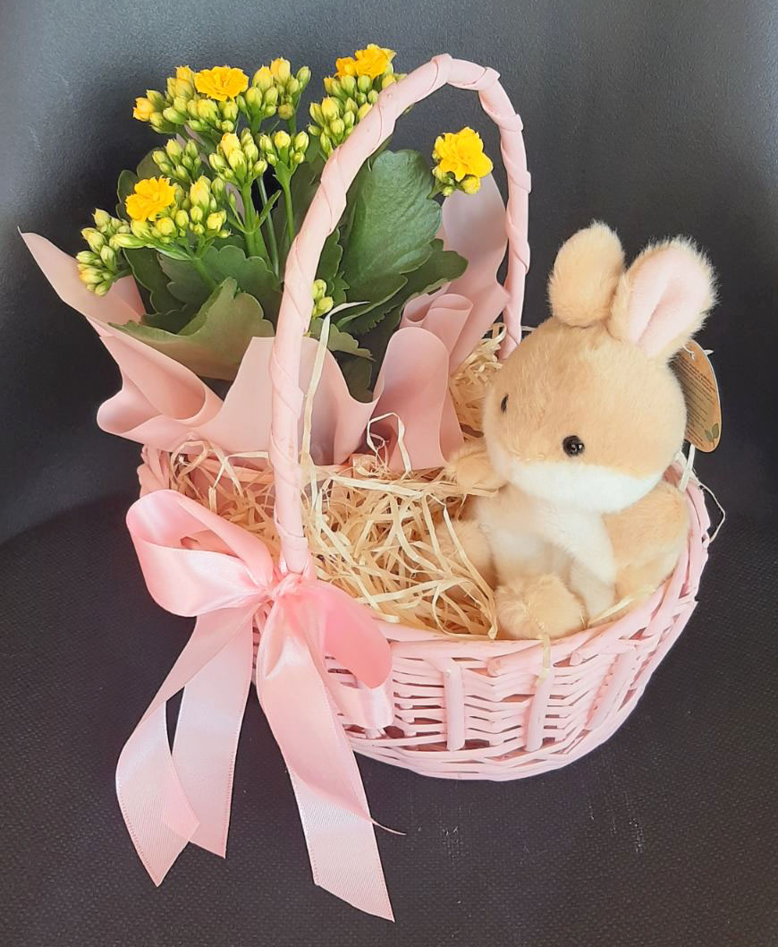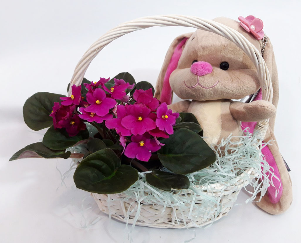 Такой очаровательный подарок в корзинке: цветущее растение в горшочке и маленькая игрушка - зайчик, или другая, в зависимости от выбора в наших магазинах. Мы выберем самую очаровательную.