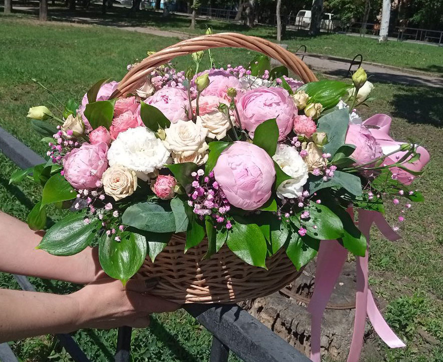 Корзина пионов и пионовидных роз
