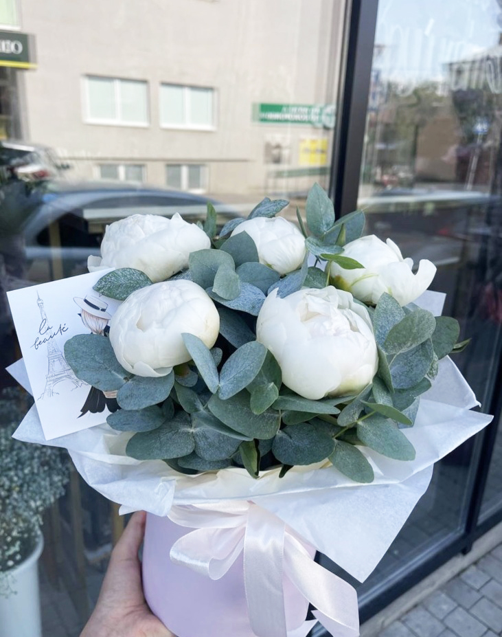 На нашей фотографии изображена композиция из 11 белых пионов в шляпной коробке, но вы можете выбрать другое их количество для своей композиции. Цвет коробки тоже может отличаться от той, что на нашем фото. Мы позаботимся о наиболее гармоничном сочетании цветов.