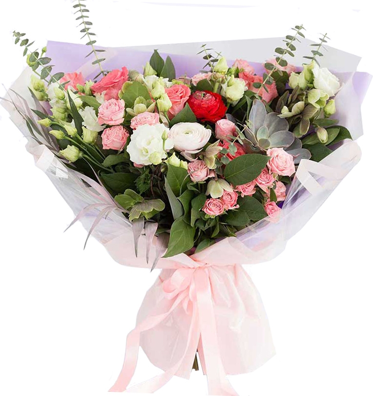 3 x ранункулюса или 5 пионовидных роз или 7 красных элитных роз (по наличию)