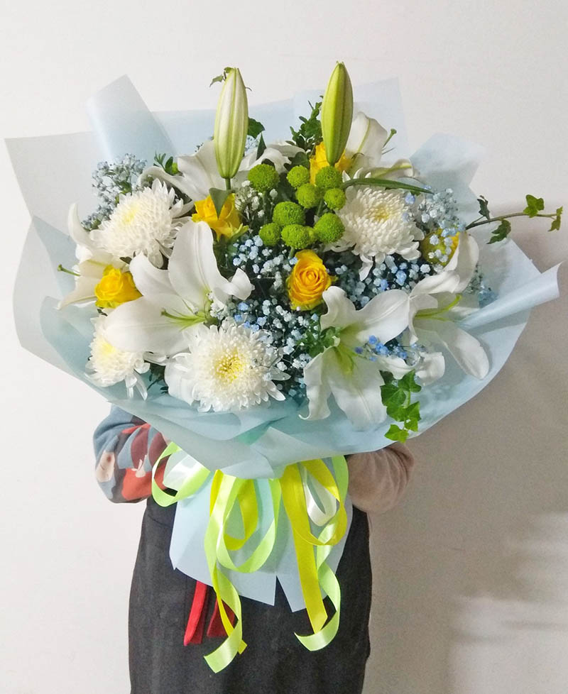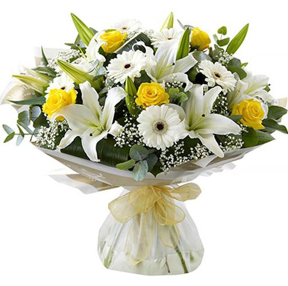 Большой букет из желтых роз, белых лилий и белых гербер или подобных им ромашковых хризантем - замечательный подарок на любое торжество.