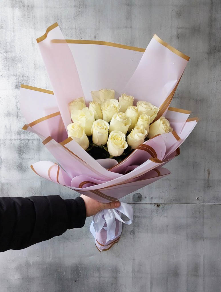 Его оформление, бумага, или сетка, бант, непременно будут подчеркивать тот посыл, который несут собой прекрасные белые розы.