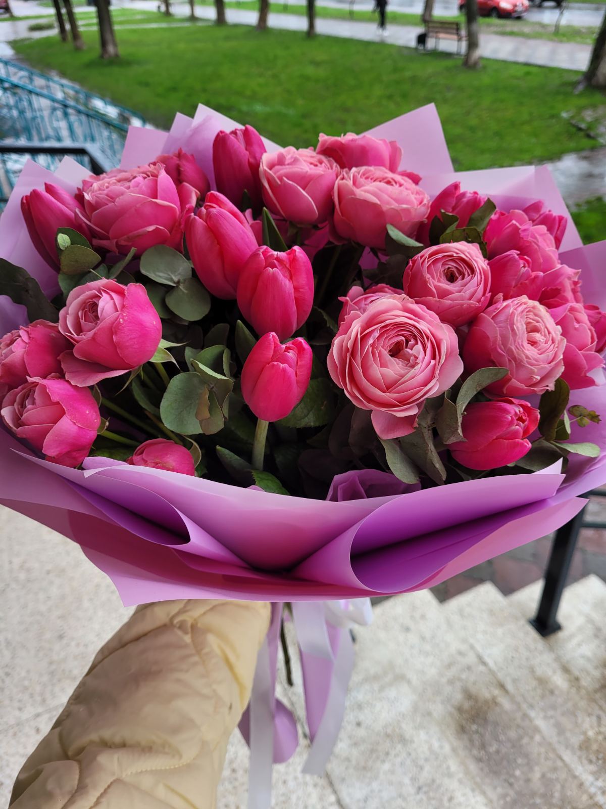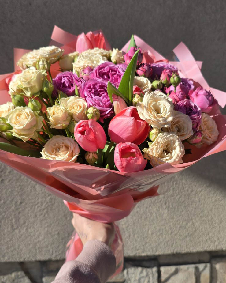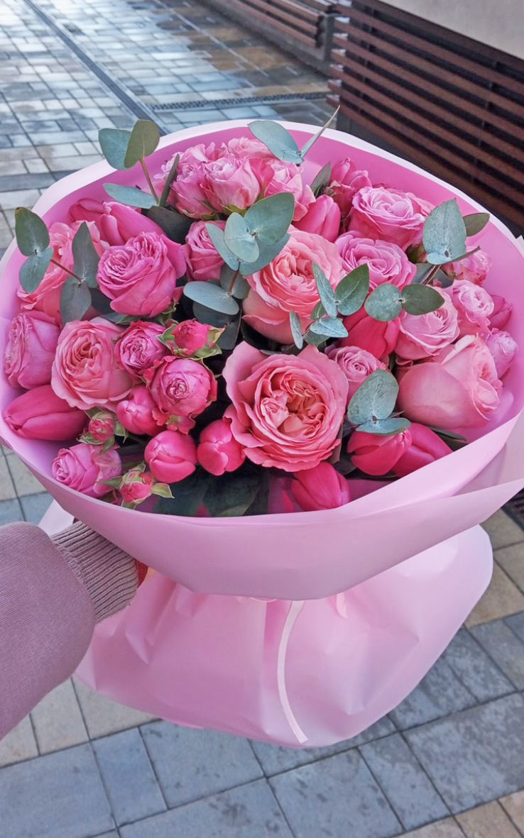 Розовые Кустовые пионовидные розы разных по яркости тонов и розовые тюльпаны составляют эту очаровательную композицию.