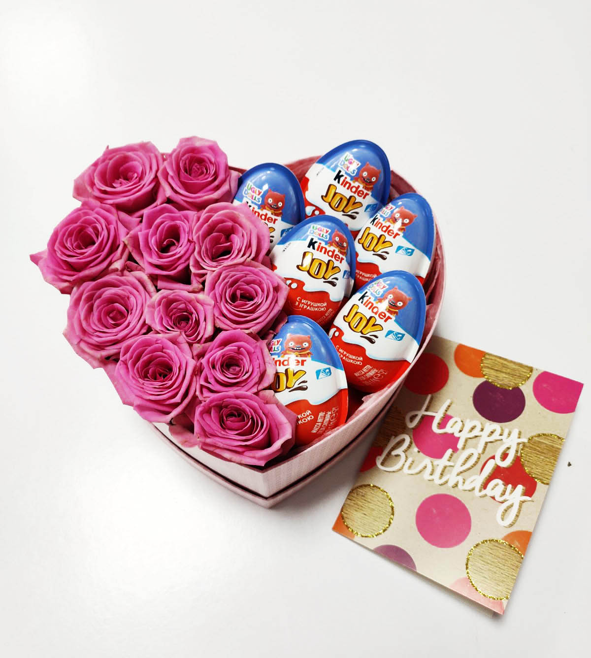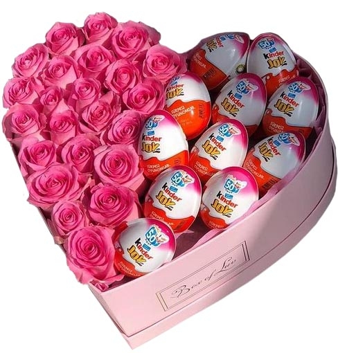 Композиция в форме сердца из розовых роз и шоколадных яиц.