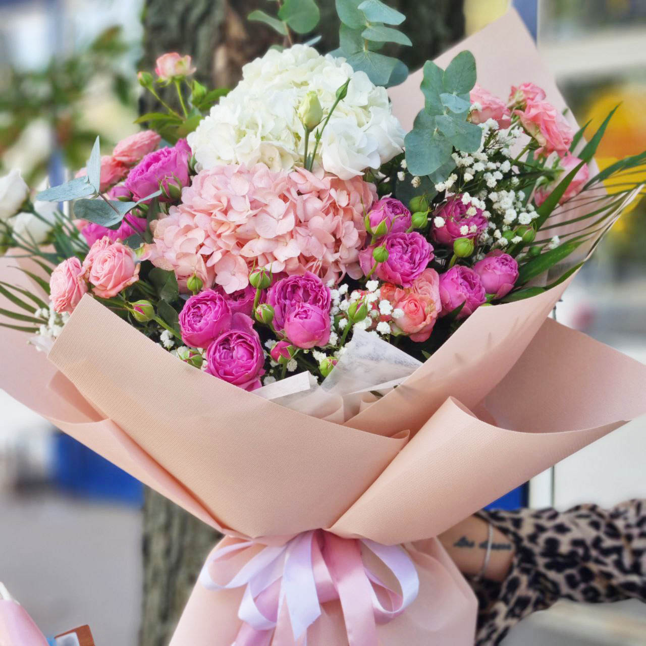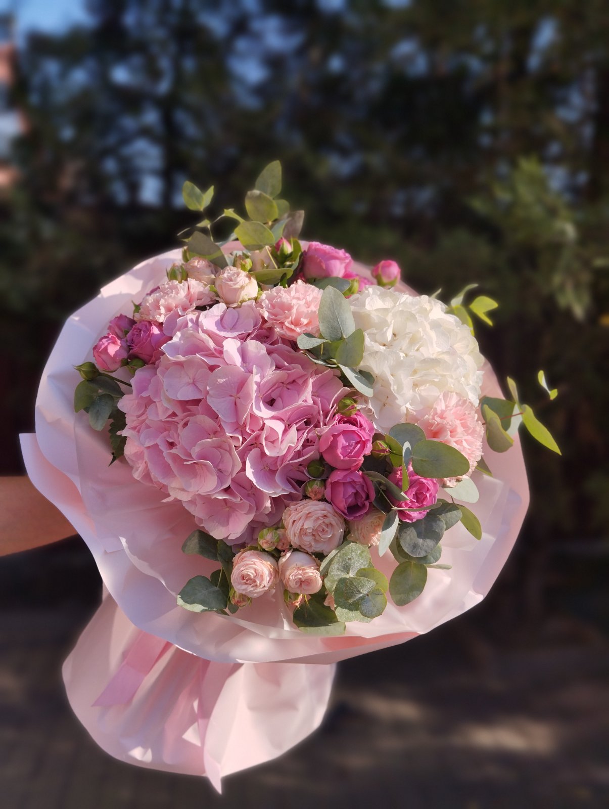 Этот огромный букет действительно роскошен, все входящие в него цветы очень объемны: 2 больших шара гортензии, кустовые пионовидные розы от светло- до ярко-розового оттенка, гвоздики и элитная зелень... Красивая современная упаковка по последним тенденциям флористической моды и атласный бант завершают прекрасный образ.