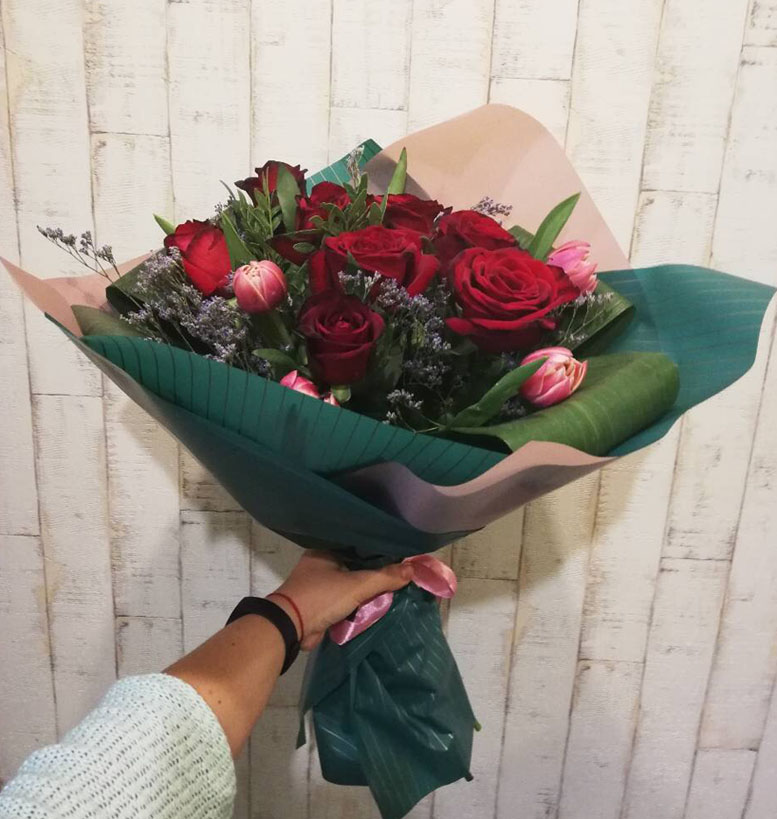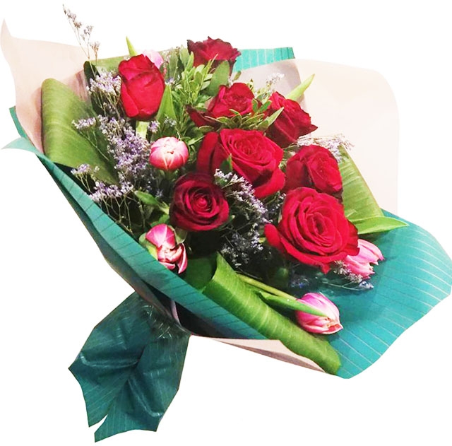 Пусть этот букет станет проводником в страну большой любви! Здесь 8 красных роз и 7 красных тюльпанов.