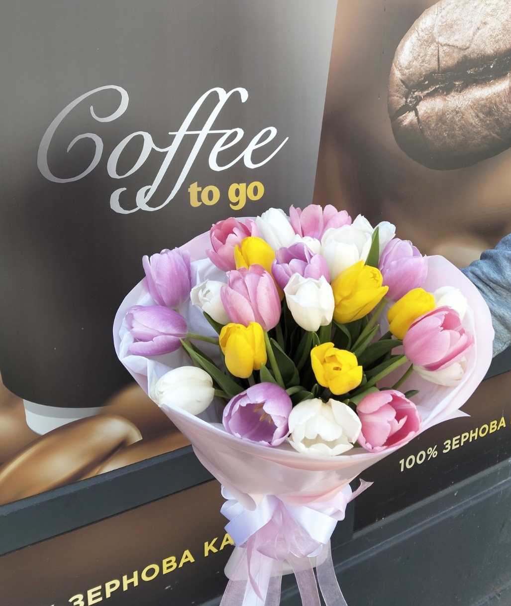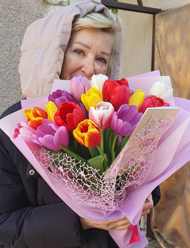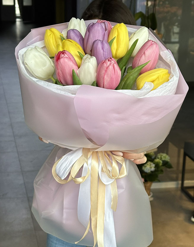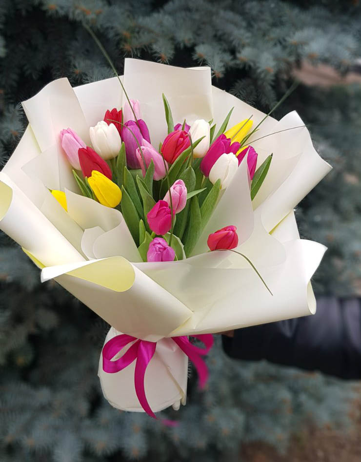 Букет из тюльпанов разного цвета может быть доставлен только в период примерно с января-февраля до апреля - в период цветения тюльпанов.