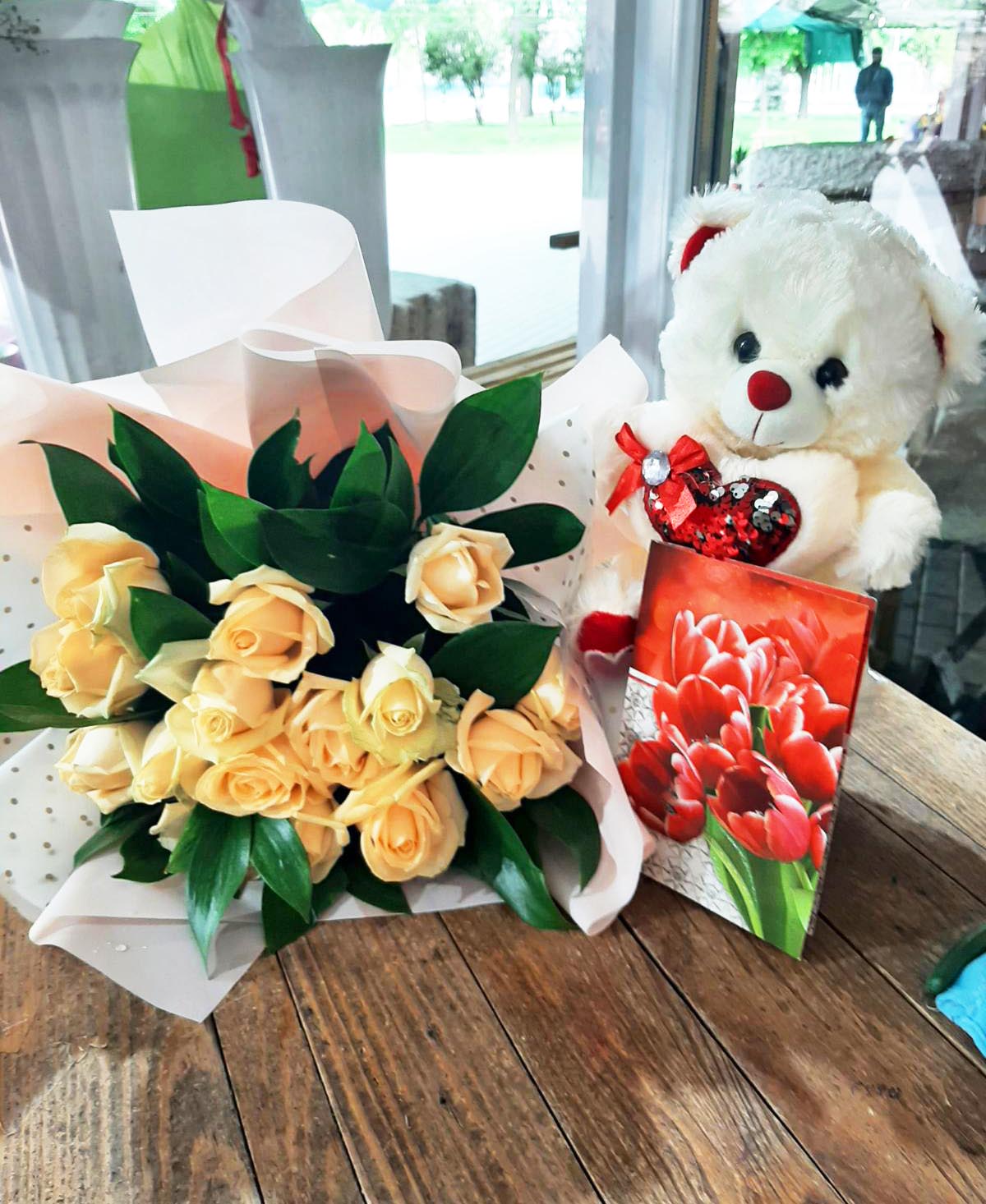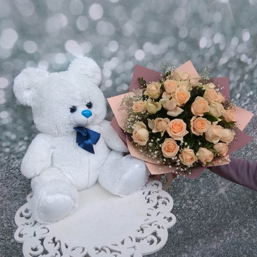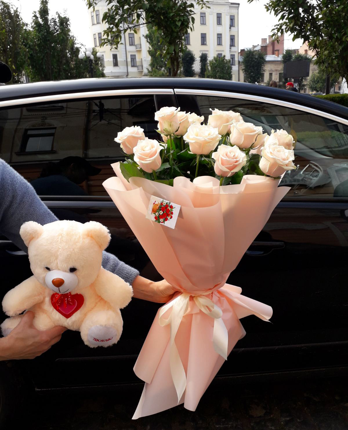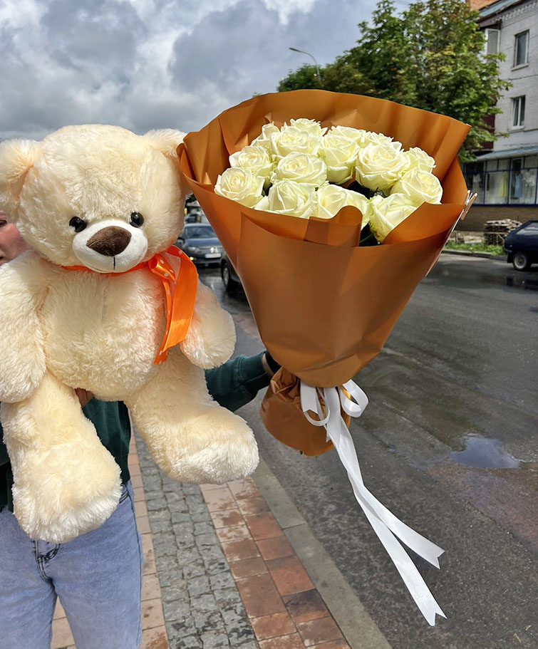 The color of the Bear can be different than the one at the photo: florists buy it at the local shops after getting a certain order. We select the most appropriate of those that are available at the moment. If you have any specific wish as to its color, please, write us at the "Comments" and we'll do our best to follow your wish if only there is a chance!