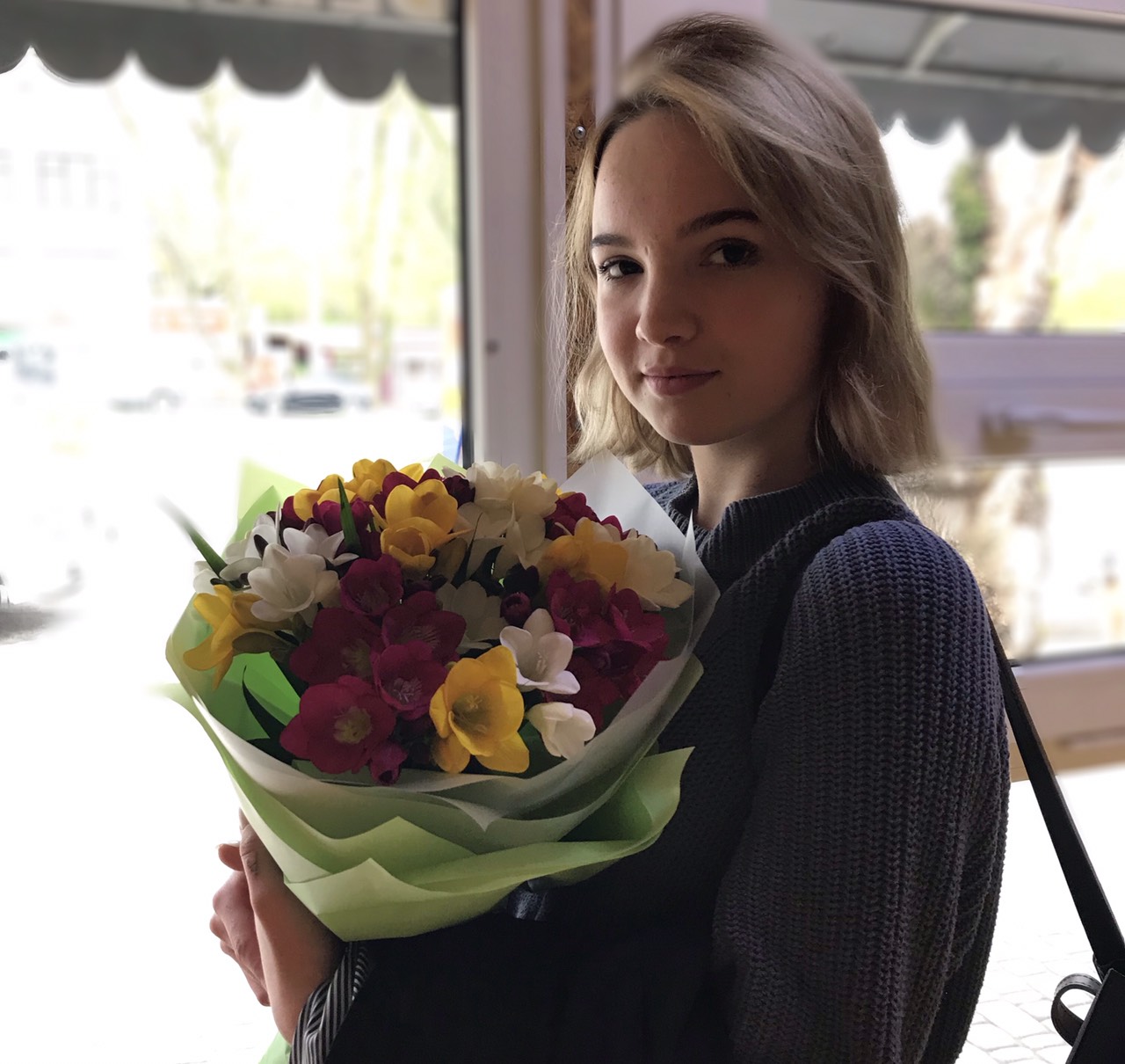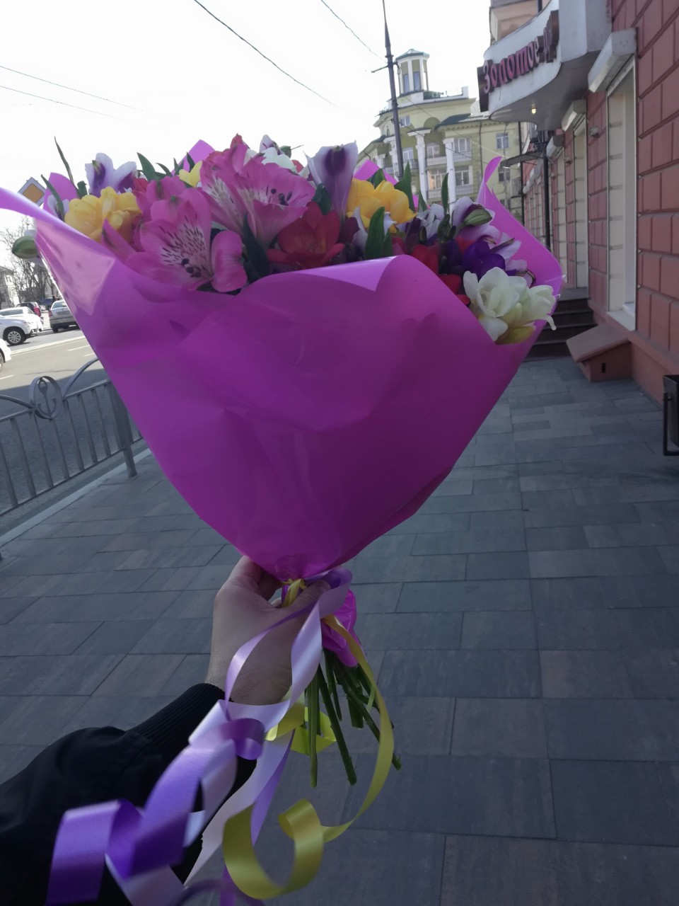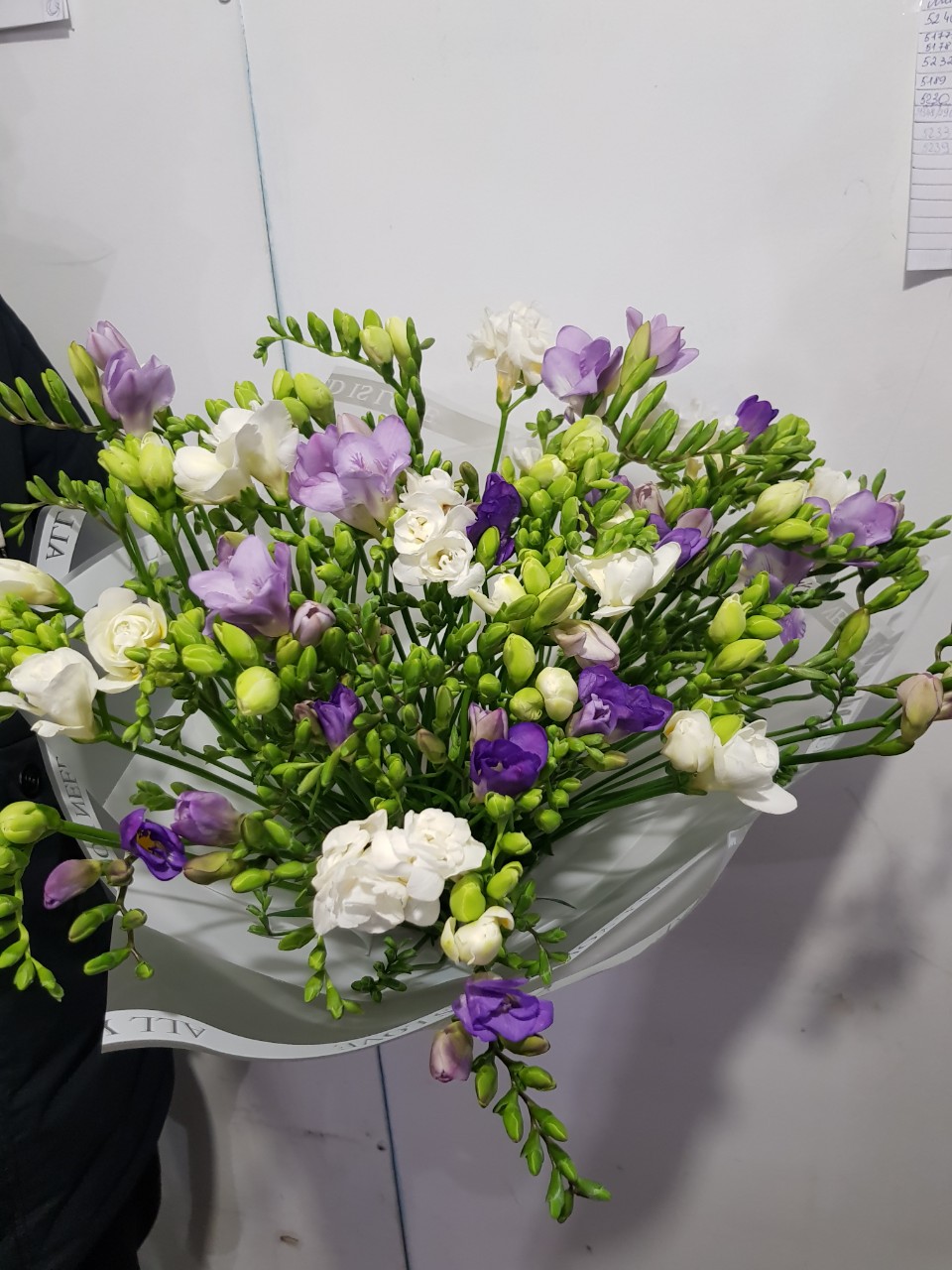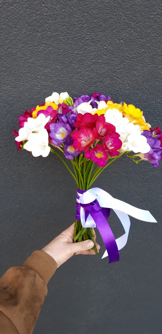 Very bright and at the same time tender spring bouquet of 35 multi-colored Freesias.