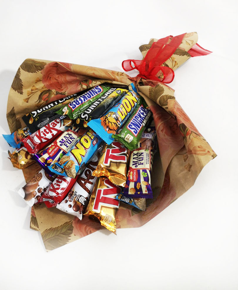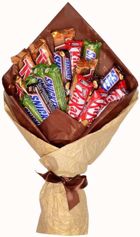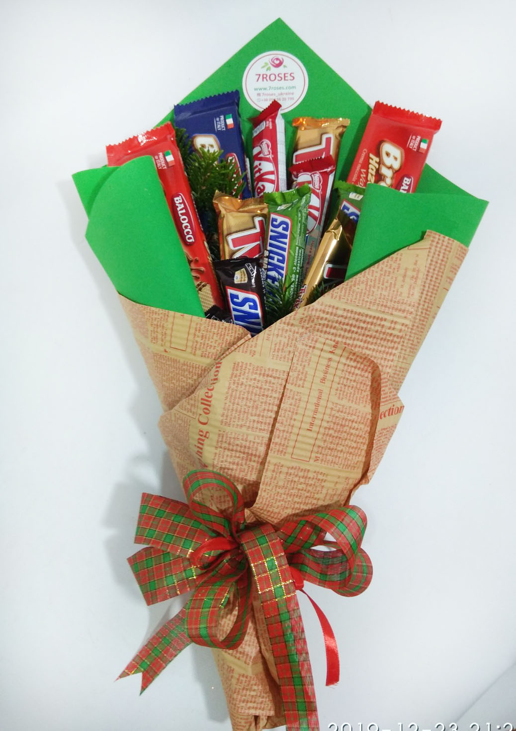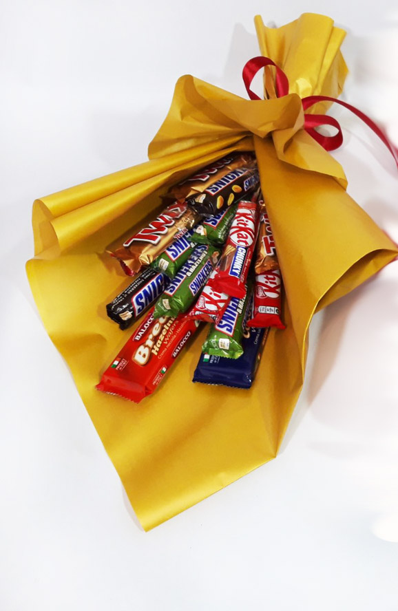 This bouquet includes 12 chocolate bars of a various producers and 6 chocolate glazed wafers