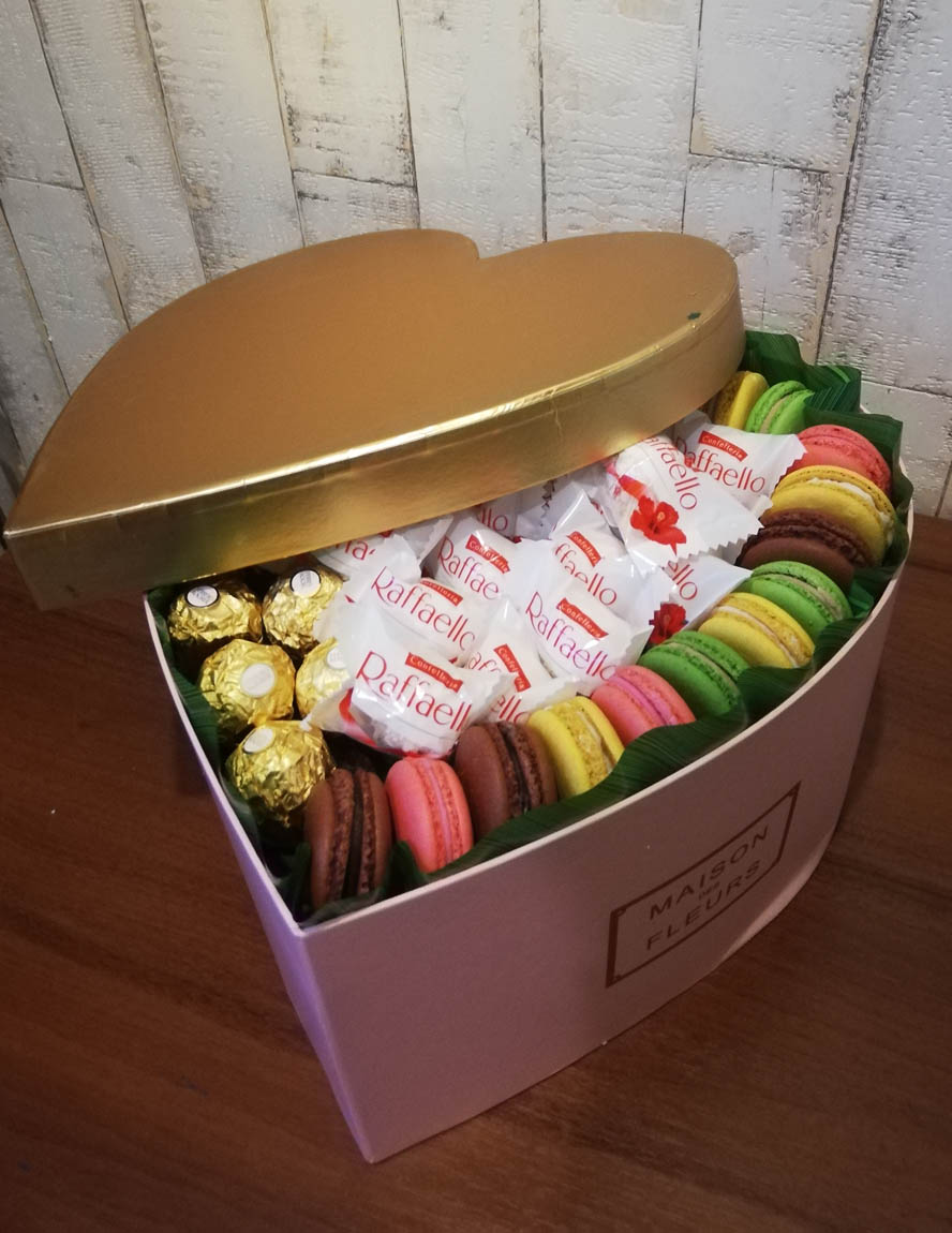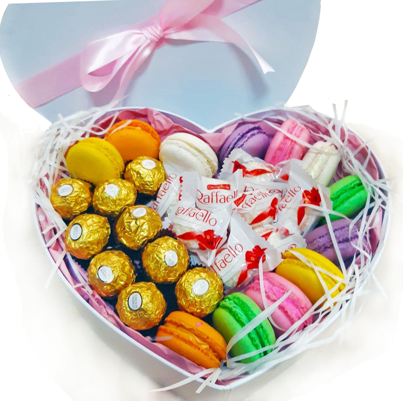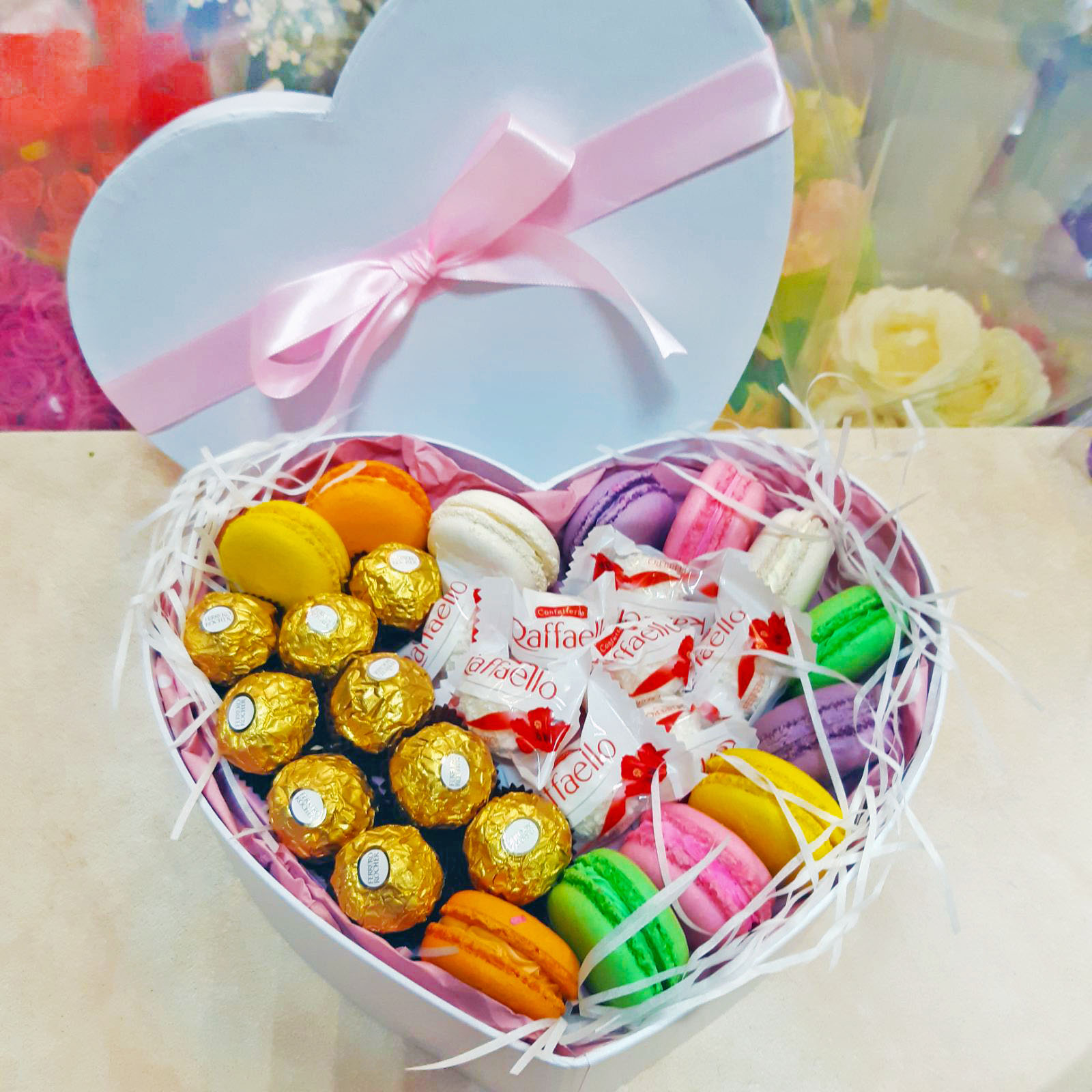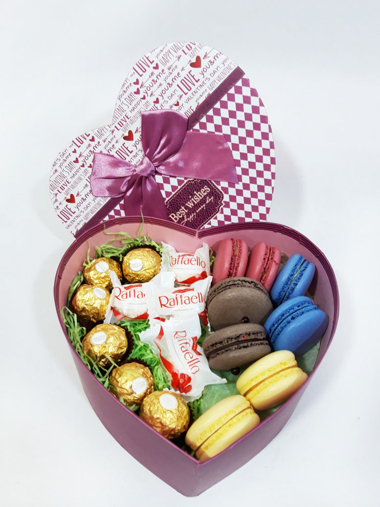 This sweets set includes the absolutely delicious Raffaello candies, Ferrero Rocher and...Makaroons! It is packed into a beautiful gift-box, The shape and a color of the gift box can be different, i.e. we'll make this arrangement at a round, square or rectangular box if a heart shaped boxes are not available at our flower shop at the moment.