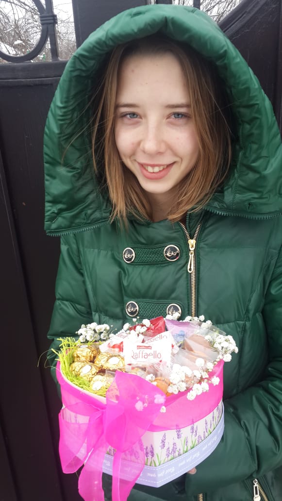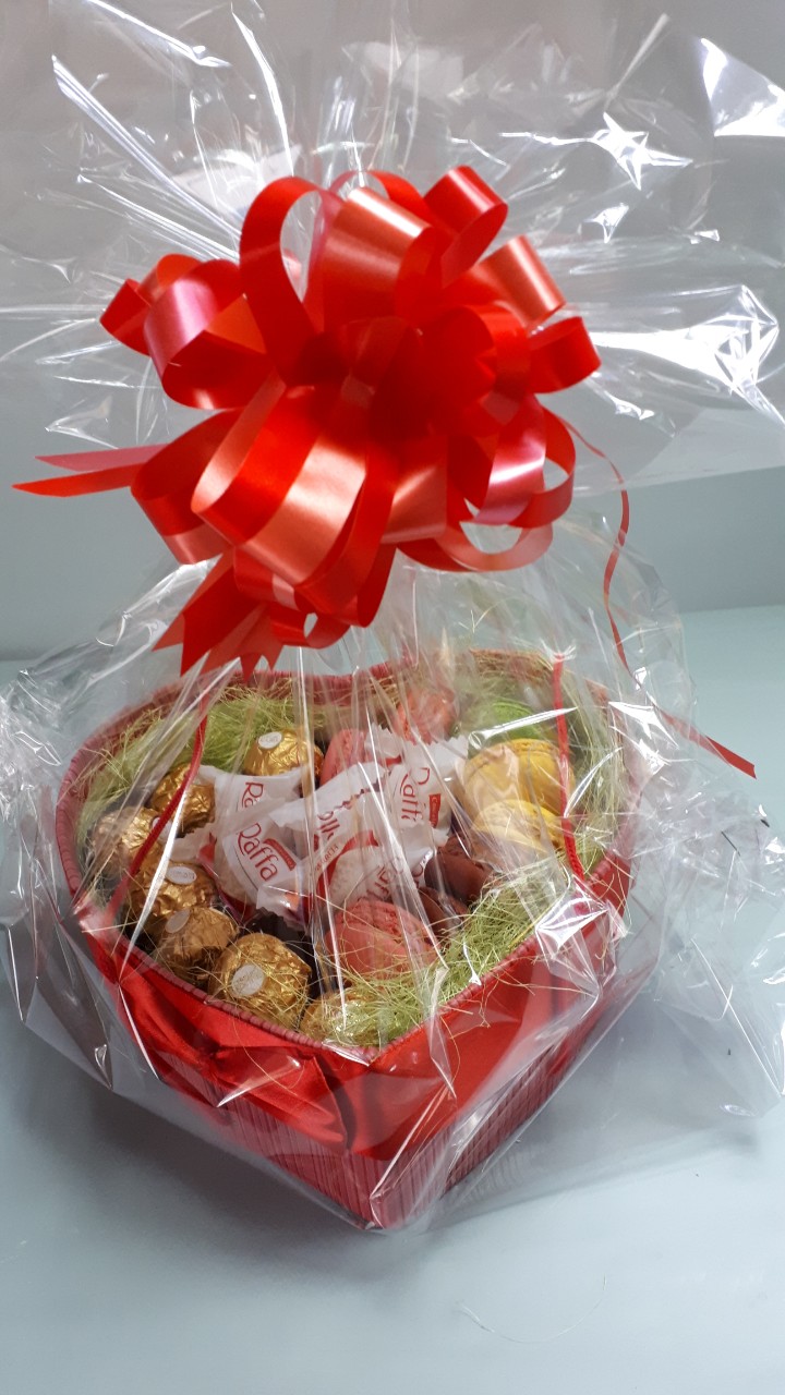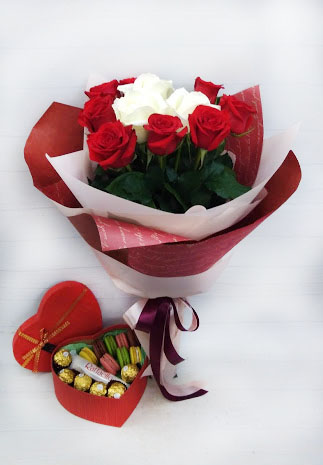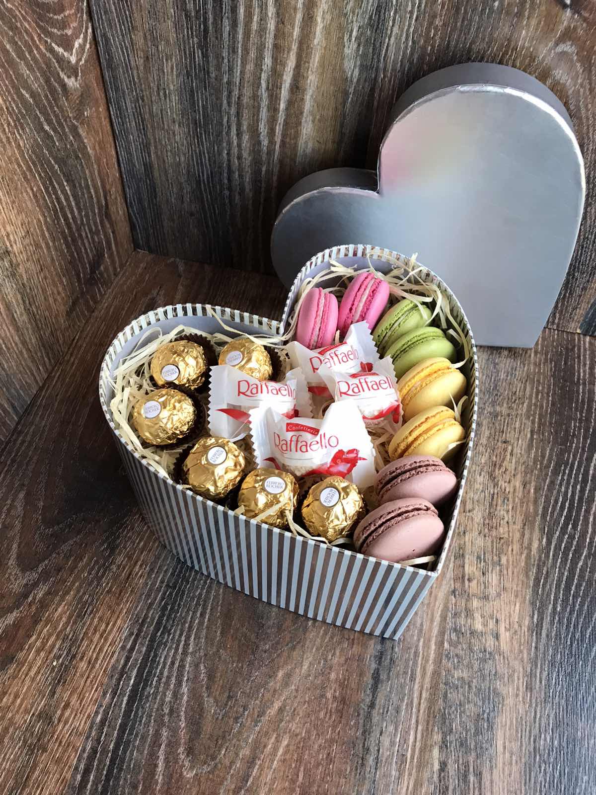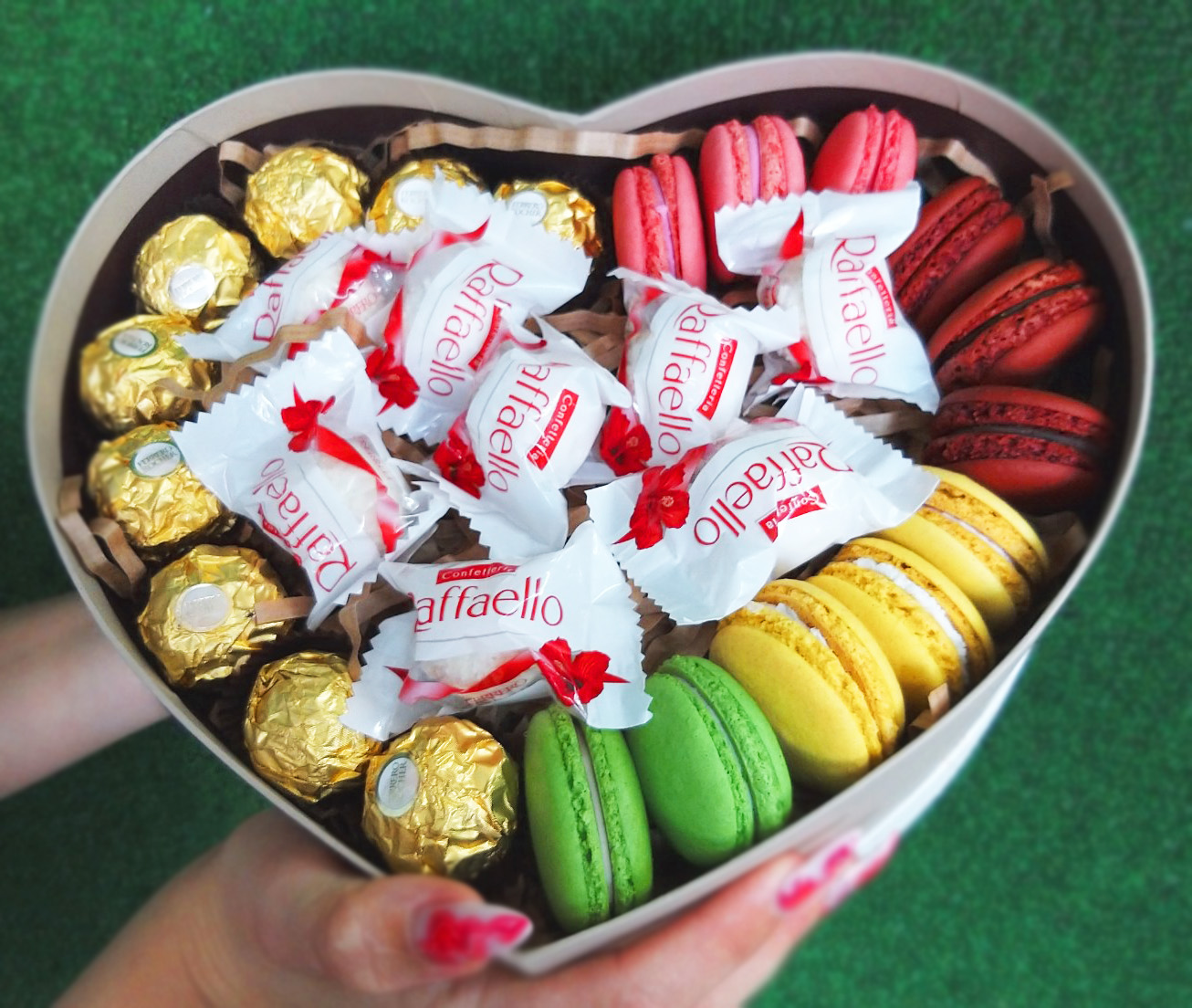 This sweets set includes the absolutely delicious Raffaello candies, Ferrero Rocher and...Makaroons! It is packed into a beautiful gift-box, The shape and a color of the gift box can be different, i.e. we'll make this arrangement at a round, square or rectangular box if a heart shaped boxes are not available at our flower shop at the moment.