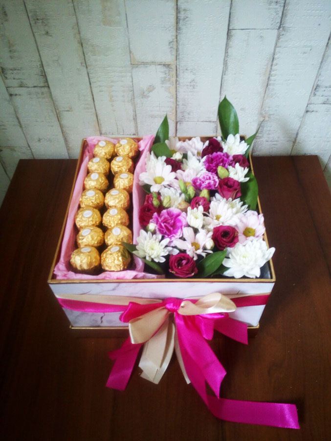 This gift box with a satin bow includes chrysanthemums: yellow, red, white...and 2 rows of heavenly delicious Ferrero Rocher chocolate candies in golden wrapping