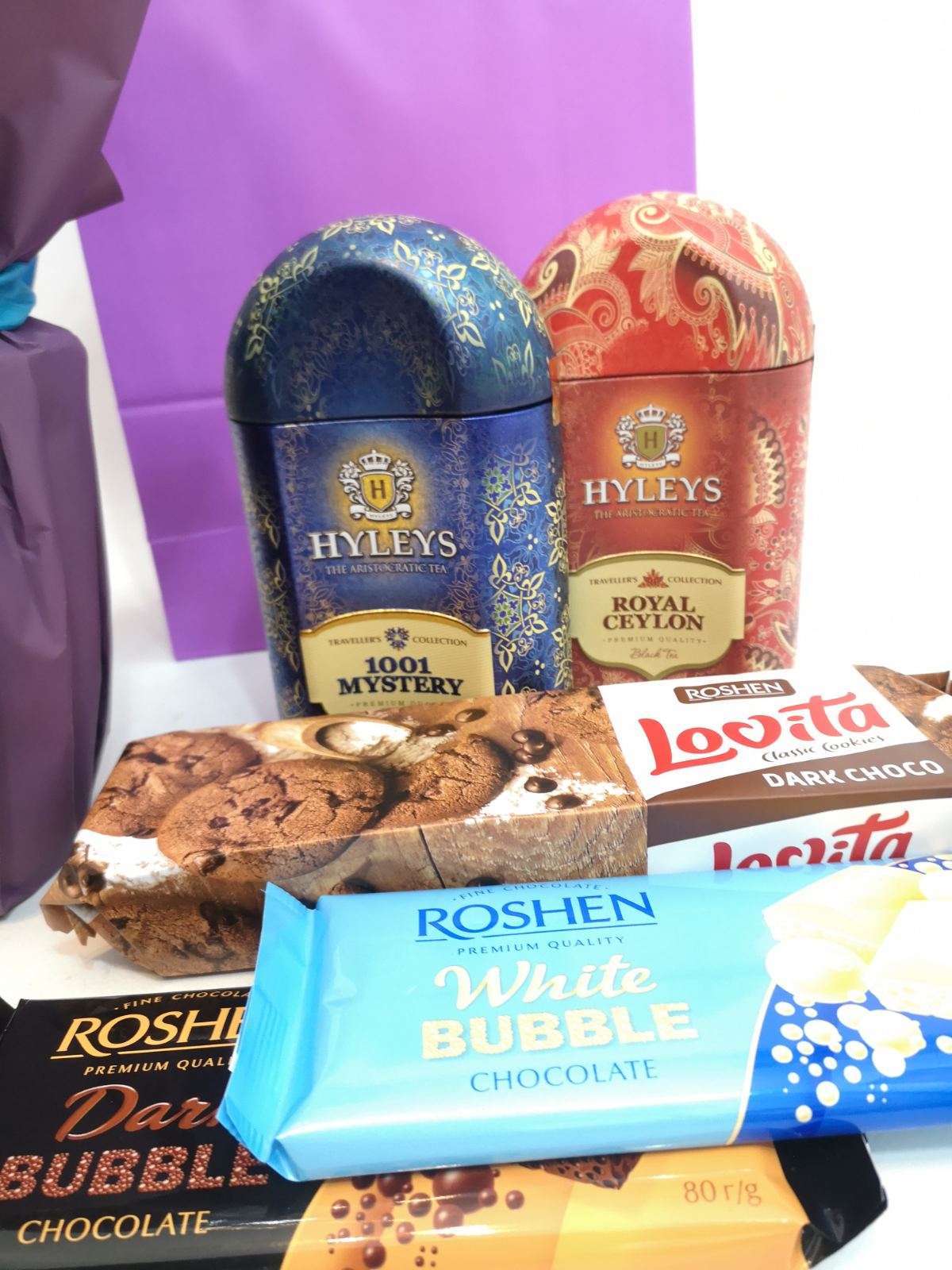 2 x Kinds of Lovare tea in cans, 80g/each 1 x White chocolate