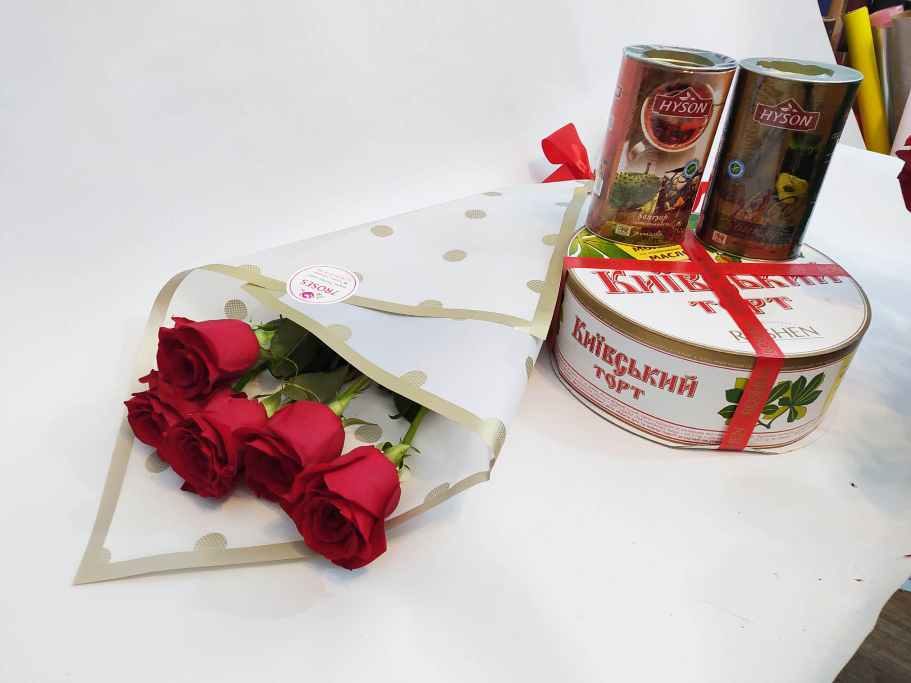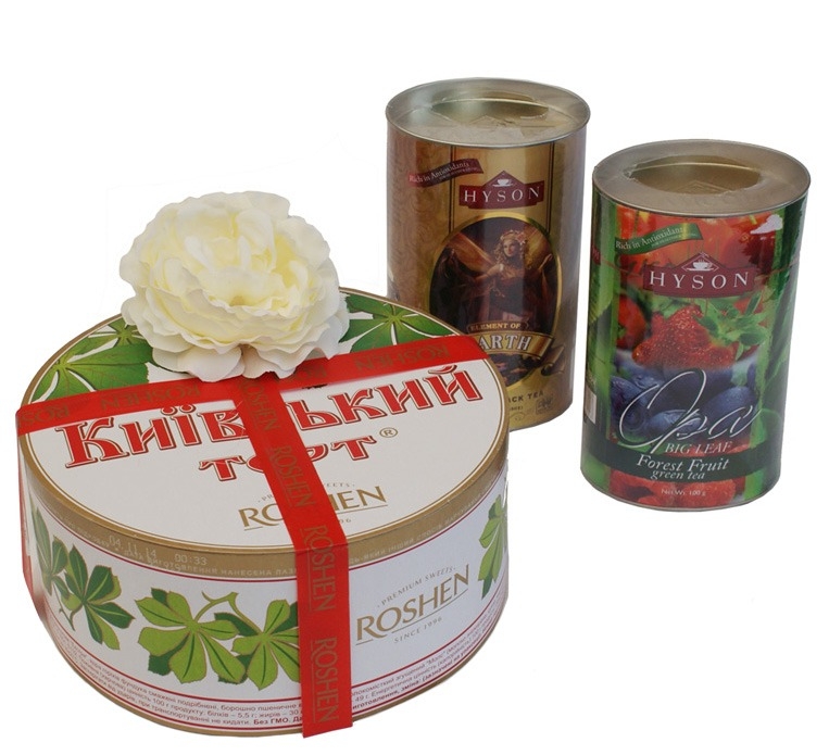 The set consists of 2 cans of tea and a cake classic by either Roshen or Vatsak brands.