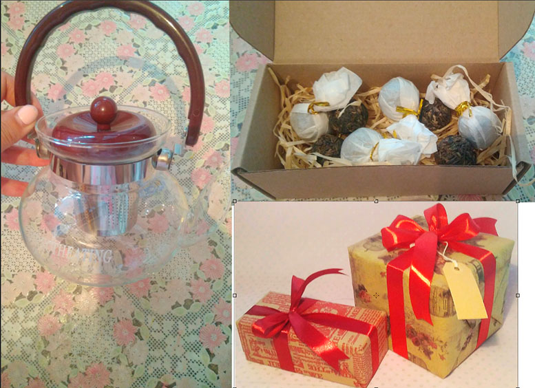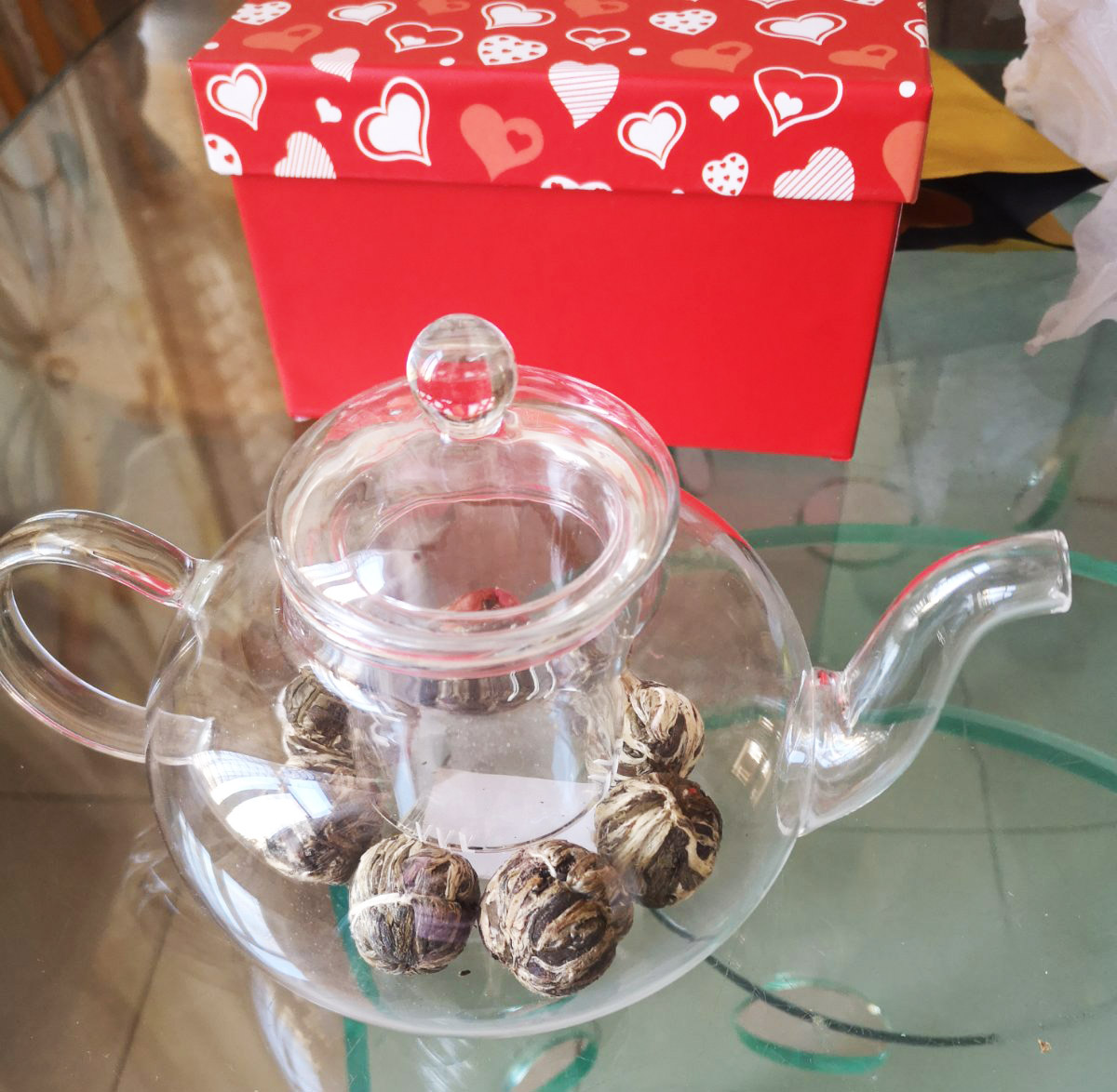 This is a set of Chinese flowering elite tea and glass tea pot. After you put such a ball in the teapot and poured it with boiled water, it opens, turning into a beautiful flower!