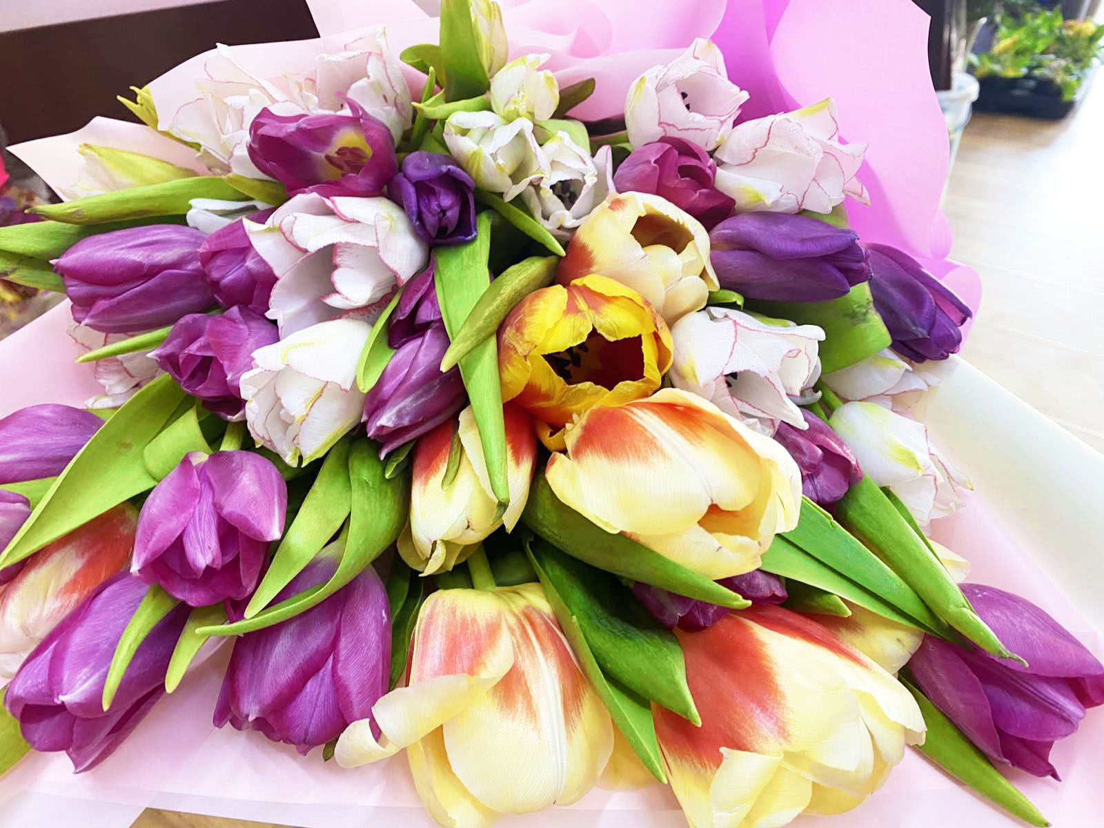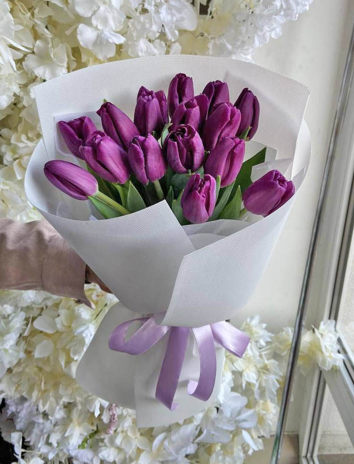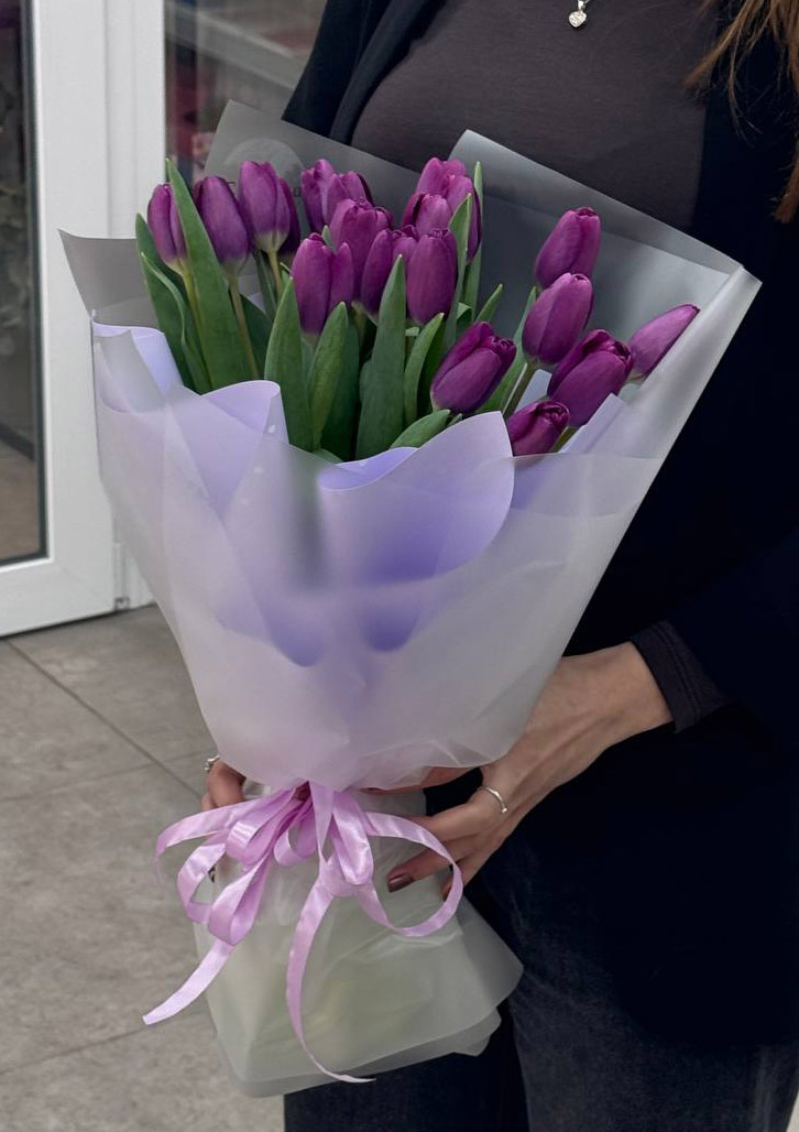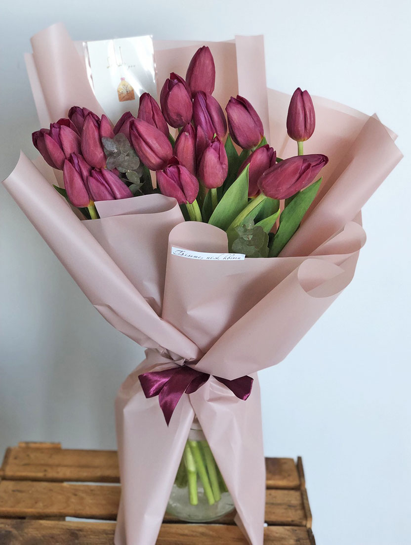 Our photo shows 51 tulips bouquet, but you could choose any other number of flowers for your bouquet.