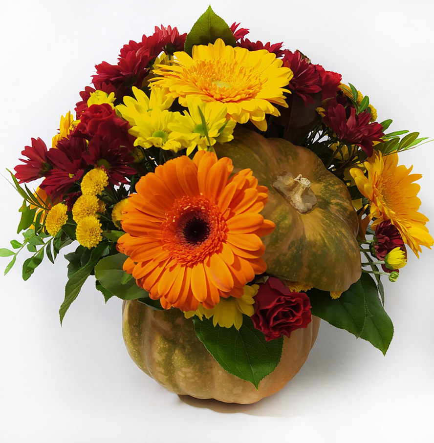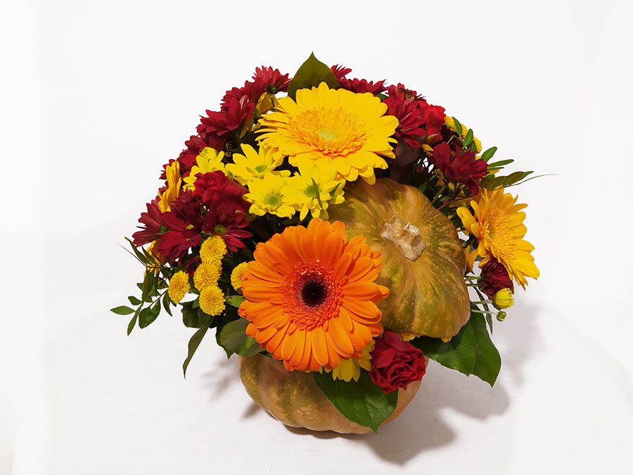 Композиція з осінніх квітів в помаранчевих і жовто-червоних тонах, в обрамленні осіннього листя, що вже почали змінювати свій колір з зеленого на жовтий і червоний, з включенням ягід помаранчевих або червоних - в гарбузі - чудовий, несподіваний, цікавий подарунок і для жінки, і для чоловіка.