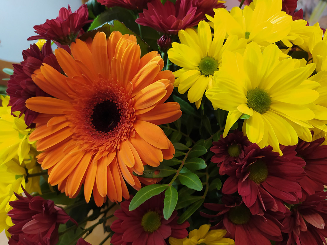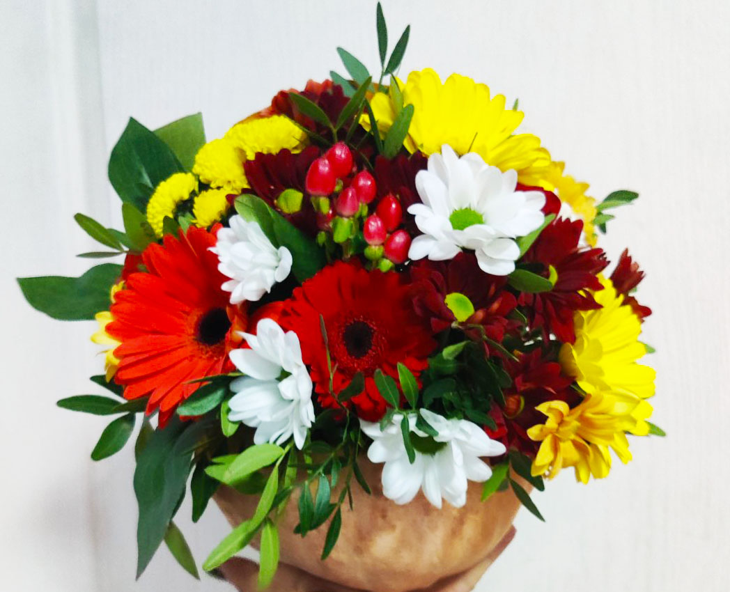 Композиція включає гербери, хризантеми та інші квіти жовтого-оранжевого і червоного кольору, що нагадують, що золота осінь вже прийшла ...