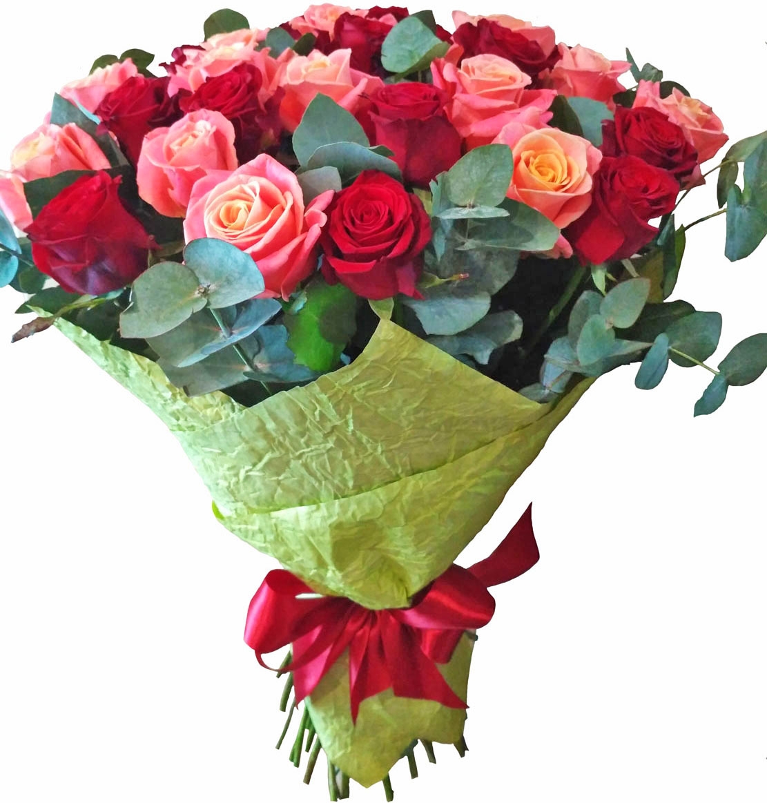 Приголомшливої ​​краси букет з 15 червоних і 15 рожевих класичних троянд довжиною стебла 60-70 см в сучасному стильному оформленні.