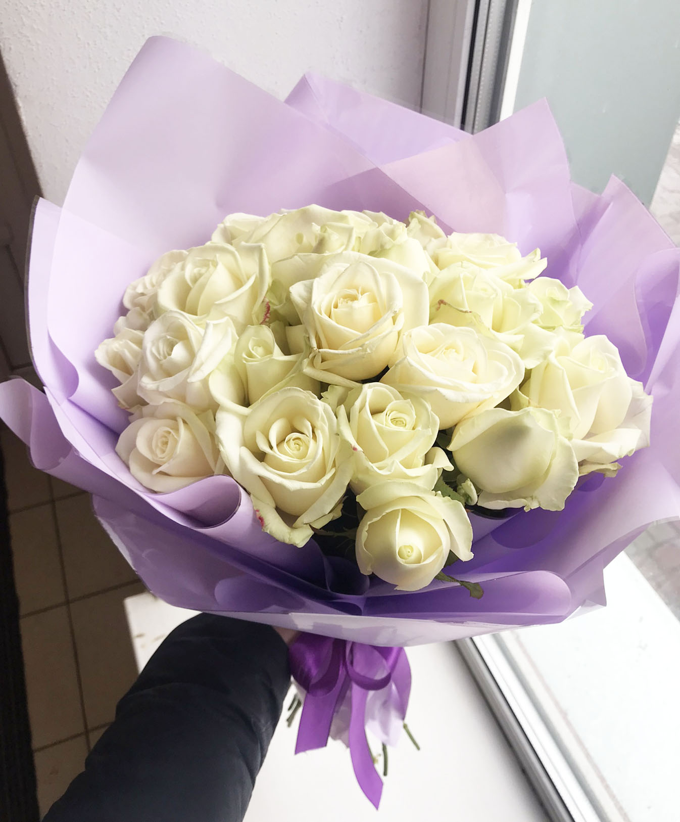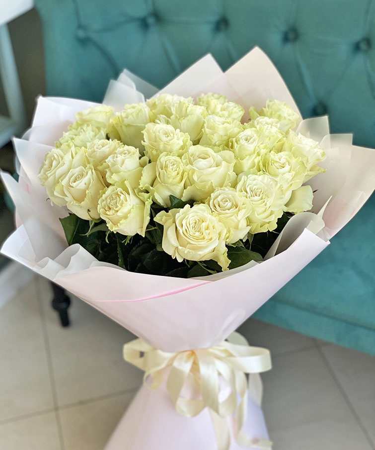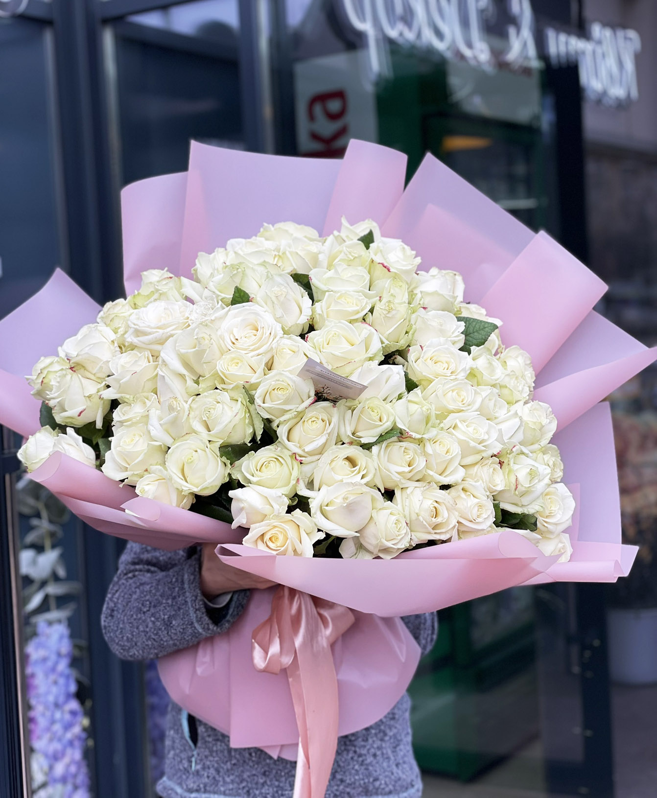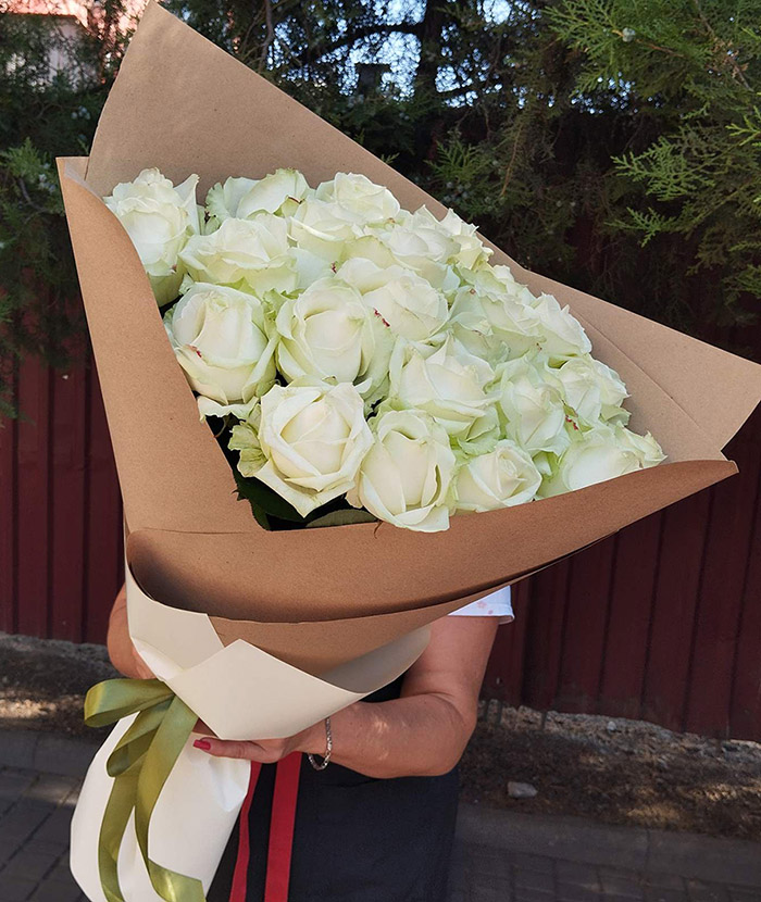 На цій сторінці можна замовити букет з білосніжних троянд висотою стебла 60-70см . В букет також увійдуть гілки декоративної зелені і він буде з великим смаком упакований в підходящу для цього букета папір, сітку, целофан, або органзу. Флорист-дизайнер прийме найкраще в цьому сенсі рішення