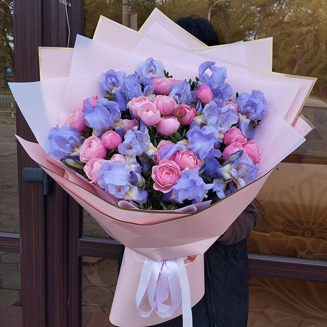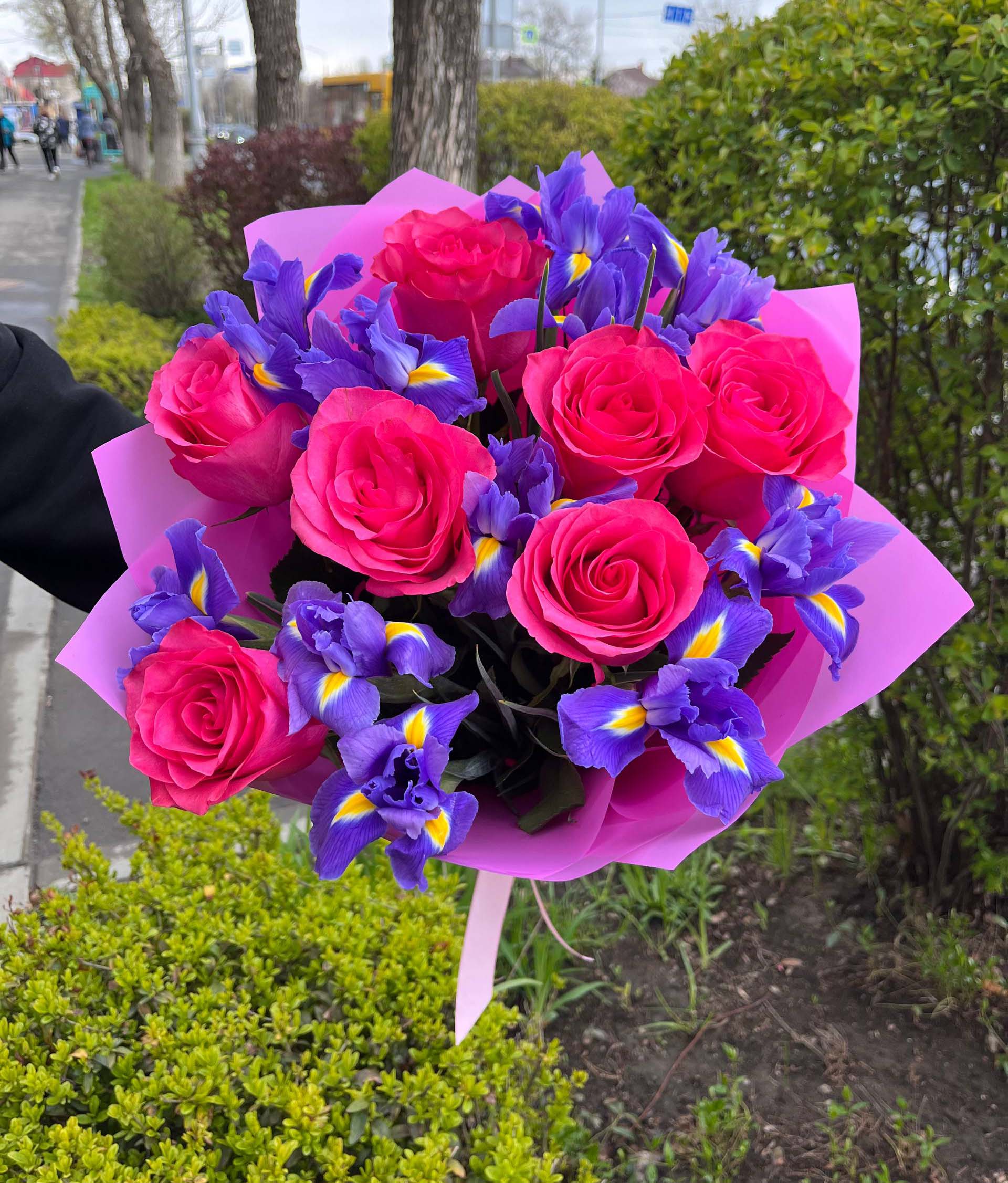 На нашому фото - Великий букет троянд та ірисів, а ви можете вибрати як менший, так і ще більший букет!