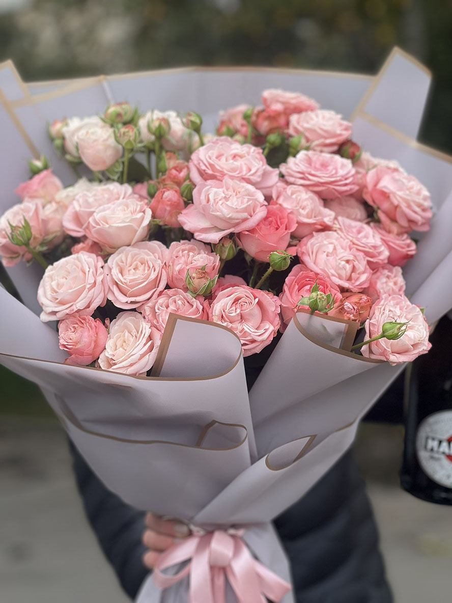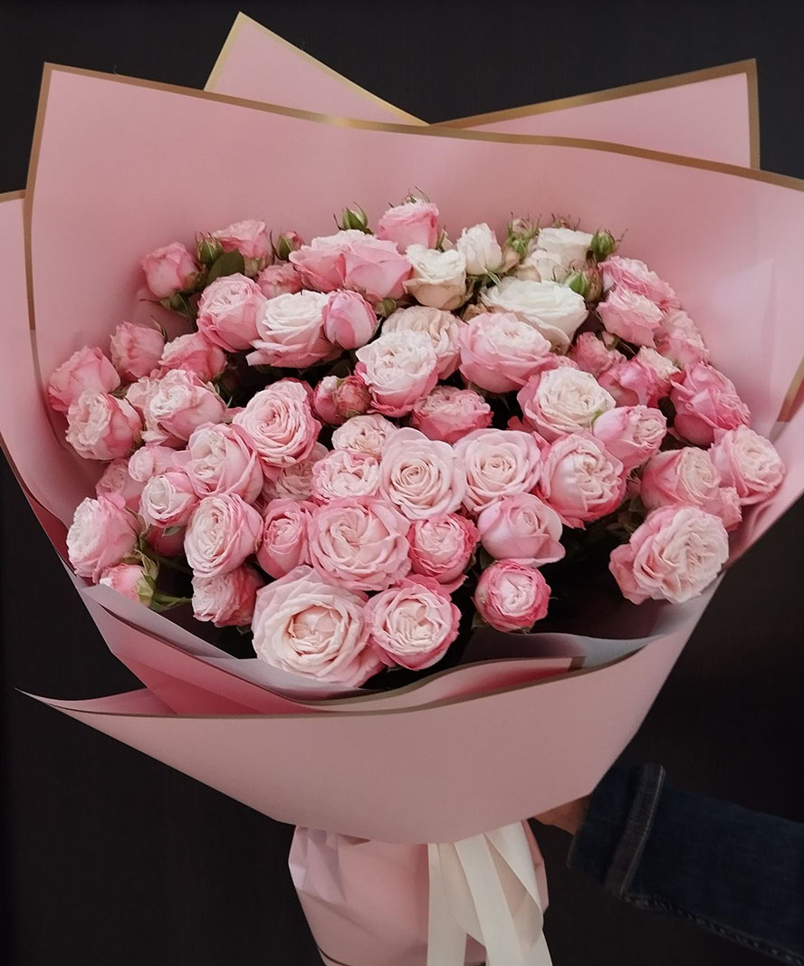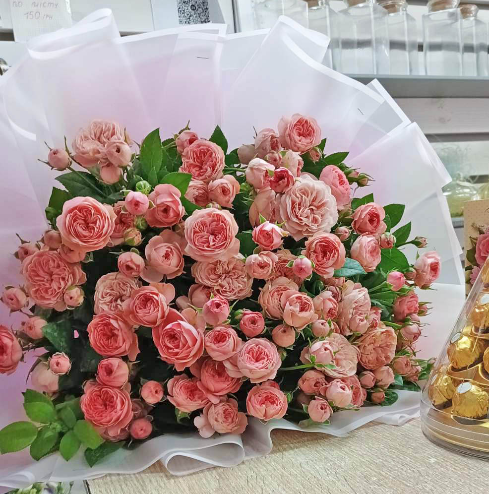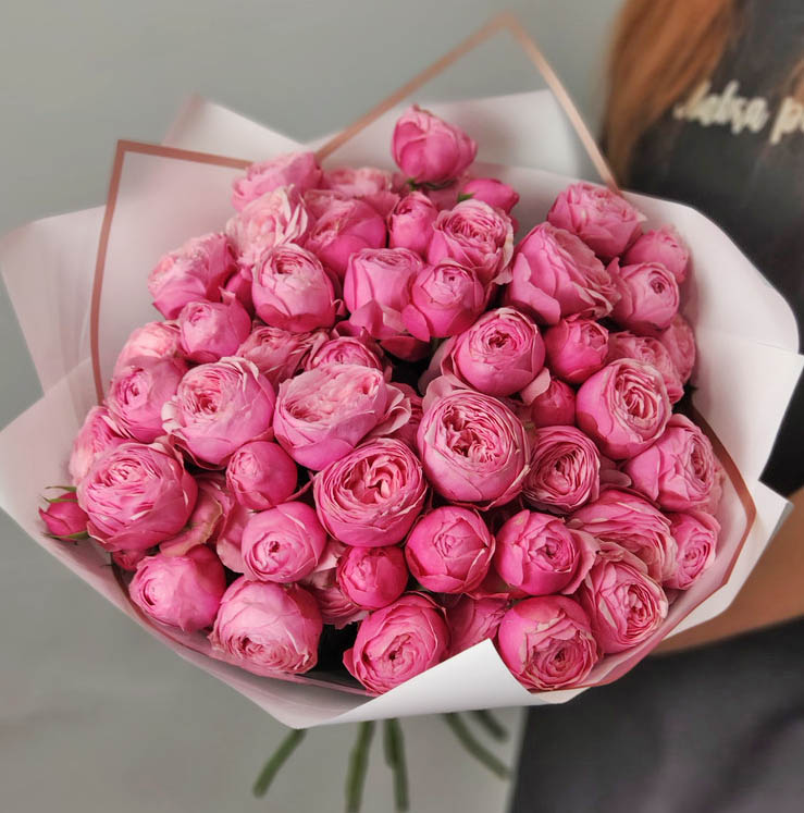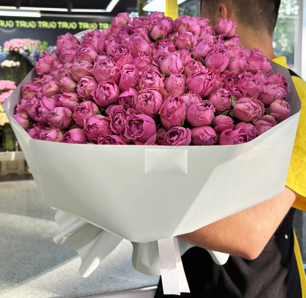 На нашому фото представлений букет з 35 стебел піоноподібних троянд кущових Бомбастик, але в букетi не менше 100 троянд!